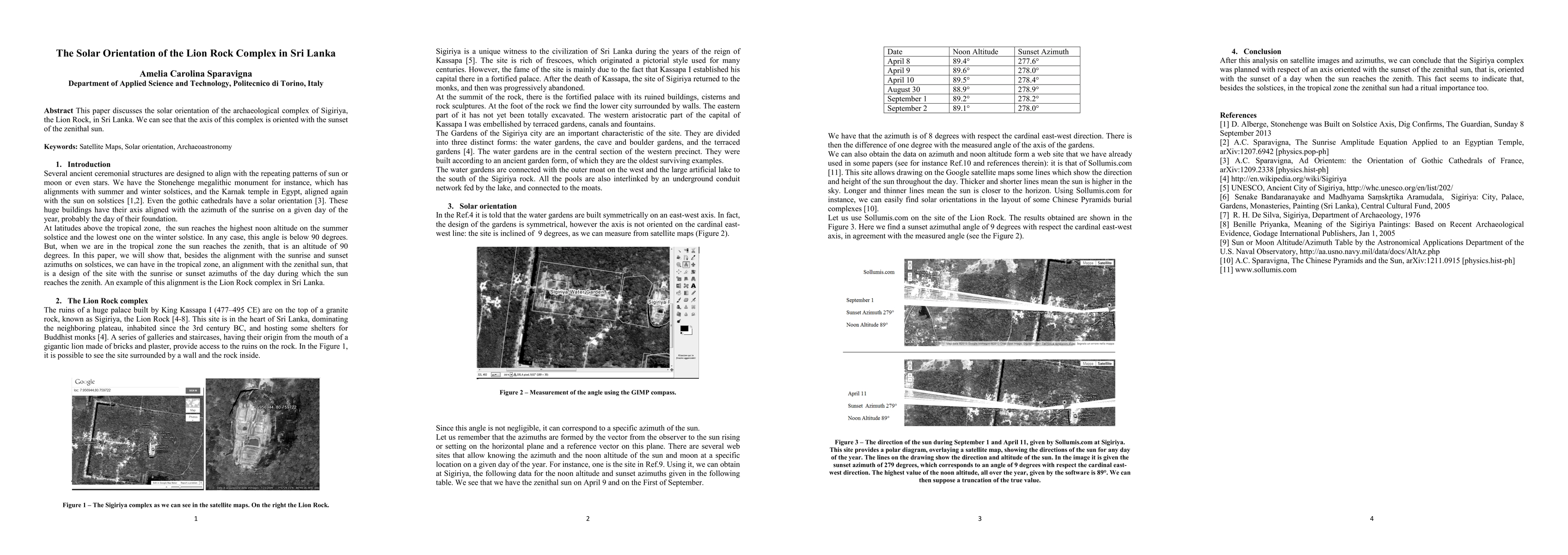 This paper discusses the solar orientation of the archaeological complex of Sigiriya, the Lion Rock, in Sri Lanka. We can see that the axis of this complex is oriented with the sunset of the zenithal sun.