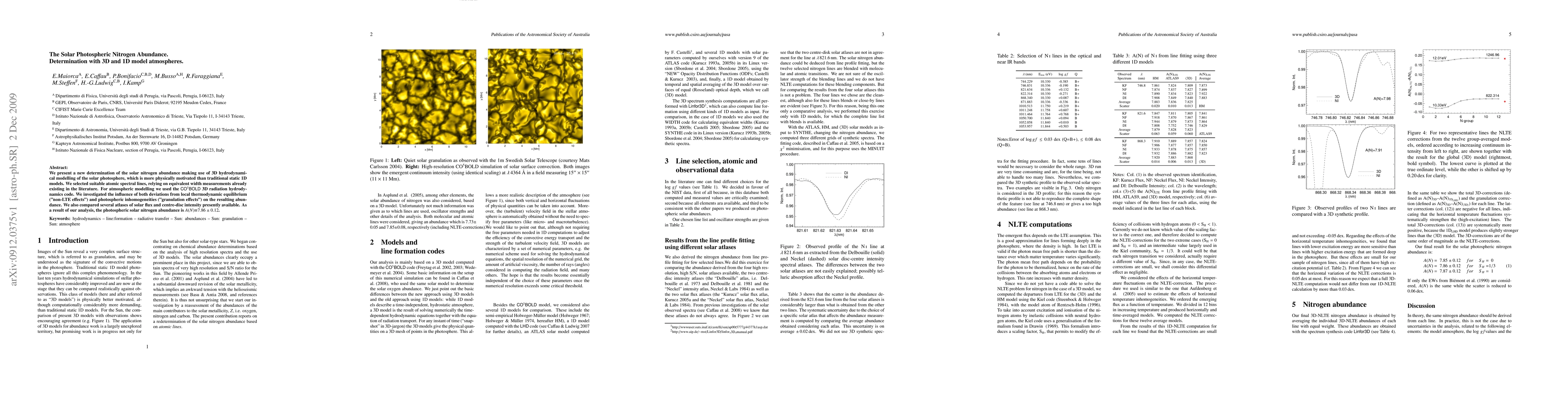 This research determines the solar nitrogen abundance using advanced 3D hydrodynamical models compared to traditional 1D models. The study finds a photospheric nitrogen abundance of A(N) = 7.86 +/- 0.12, accounting for non-LTE effects and granulation.