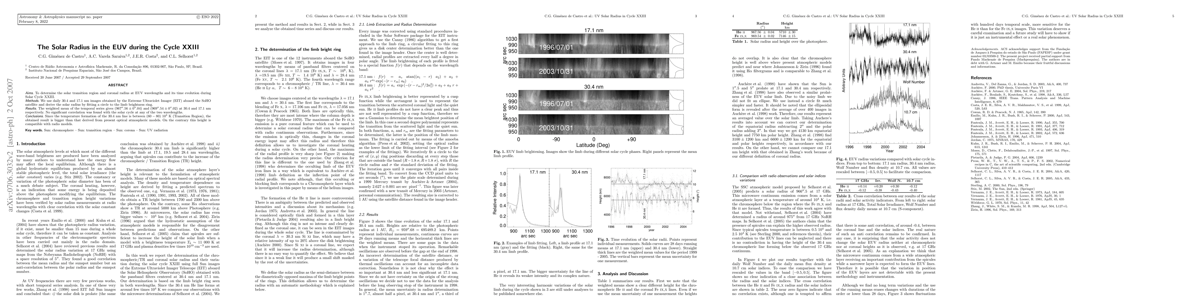This study determines the solar transition region and coronal radius at EUV wavelengths during Solar Cycle XXIII using EIT images from the SoHO satellite. The derived solar radii at 30.4 and 17.1 nm are 967''.56 +/- 0''.04 and 969''.54 +/- 0''.02 respectively, with no significant correlation to solar cycle variations.