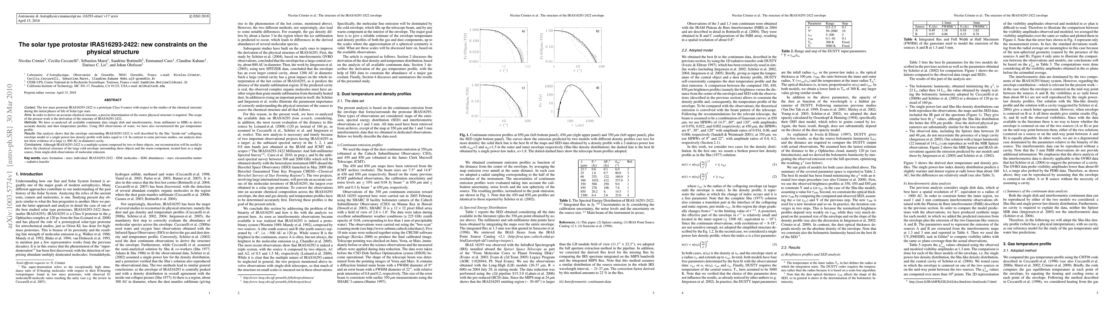 Context: The low mass protostar IRAS16293-2422 is a prototype Class 0 source with respect to the studies of the chemical structure during the initial phases of life of Solar type stars. Aims: In order to derive an accurate chemical structure, a precise determination of the source physical structure is required. The scope of the present work is the derivation of the structure of IRAS16293-2422. Methods: We have re-analyzed all available continuum data (single dish and interferometric, from millimeter to MIR) to derive accurate density and dust temperature profiles. Using ISO observations of water, we have also reconstructed the gas temperature profile. Results: Our analysis shows that the envelope surrounding IRAS16293-2422 is well described by the Shu "inside-out" collapsing envelope model or a single power-law density profile with index equal to 1.8. In contrast to some previous studies, our analysis does not show evidence of a large (>/- 800 AU in diameter) cavity. Conclusions: Although IRAS16293-2422 is a multiple system composed by two or three objects, our reconstruction will be useful to derive the chemical structure of the large cold envelope surrounding these objects and the warm component, treated here as a single source, from single-dish observations of molecular emission.