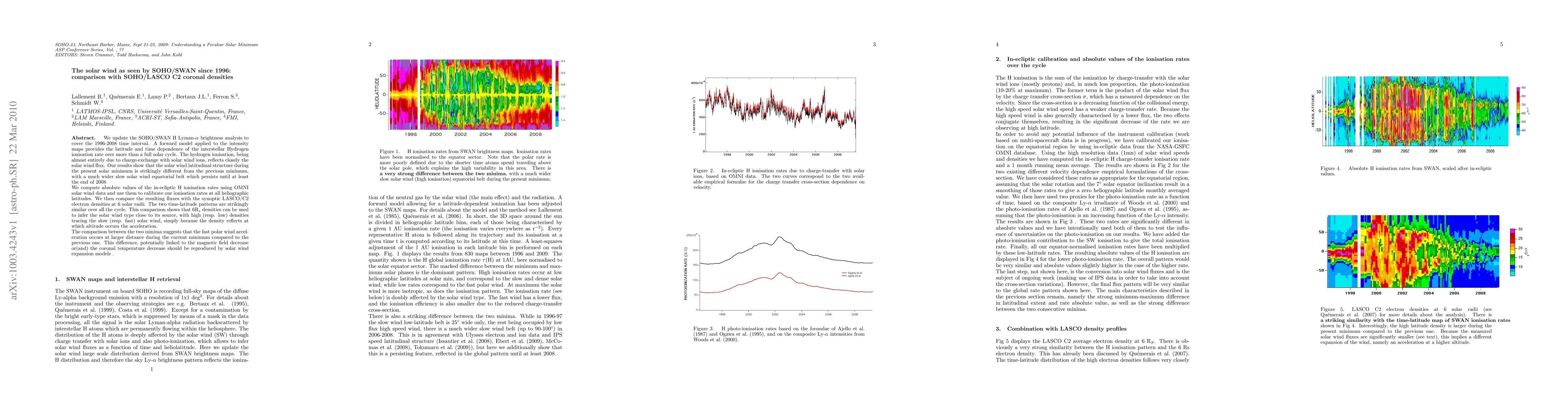 This paper analyzes SOHO/SWAN data from 1996 to 2008 to study the solar wind's latitudinal structure and its ionization rate, comparing it with SOHO/LASCO C2 coronal densities. It finds significant differences in the solar wind's equatorial belt between the current and previous solar minima and concludes that coronal densities at 6 solar radii can infer solar wind type near its source.