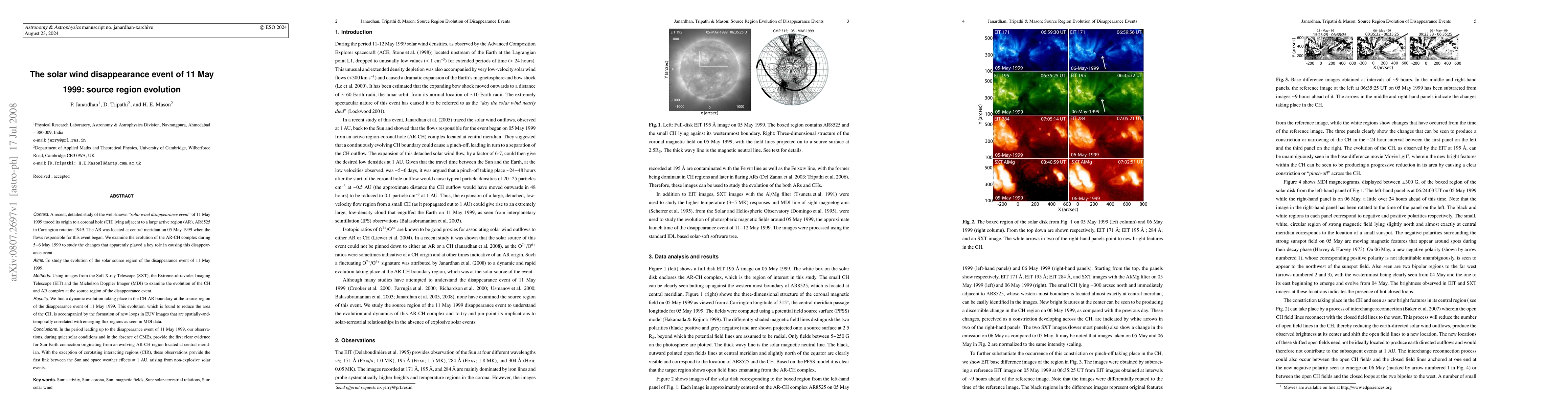 Context. A recent, detailed study of the well-known solar wind disappearance event of 11 May 1999 traced its origin to a coronal hole (CH) lying adjacent to a large active region (AR), AR8525 in Carrington rotation 1949. The AR was located at central meridian on 05 May 1999 when the flows responsible for this event began. We examine the evolution of the AR-CH complex during 5-6 May 1999 to study the changes that apparently played a key role in causing this disappearance event. Aims. To study the evolution of the solar source region of the disappearance event of 11 May 1999. Methods. Using images from the Soft X-ray Telescope (SXT), the Extreme-ultraviolet Imaging Telescope (EIT) and the Michelson Doppler Imager (MDI) to examine the evolution of the CH and AR complex at the source region of the disappearance event. Results. We find a dynamic evolution taking place in the CH-AR boundary at the source region of the disappearance event of 11 May 1999. This evolution, which is found to reduce the area of the CH, is accompanied by the formation of new loops in EUV images that are spatially and temporally correlated with emerging flux regions as seen in MDI data. Conclusions. In the period leading up to the disappearance event of 11 May 1999, our observations, during quiet solar conditions and in the absence of CMEs, provide the first clear evidence for Sun-Earth connection originating from an evolving AR-CH region located at central meridian. With the exception of corotating interacting regions (CIR), these observations provide the first link between the Sun and space weather effects at 1 AU, arising from non-explosive solar events.