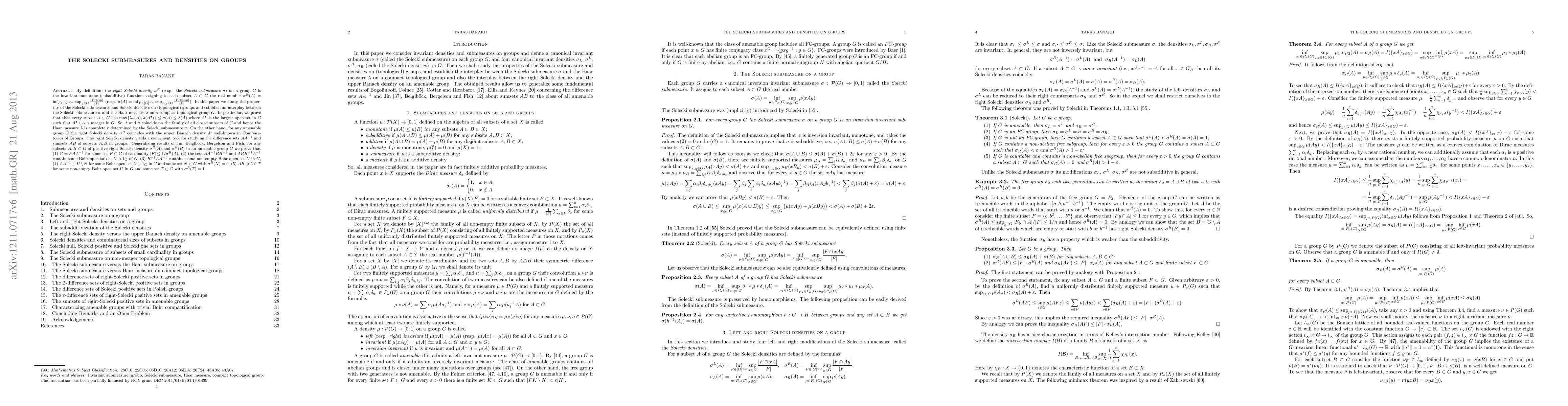 This paper introduces the Solecki submeasure on groups and explores its relationship with Haar measure on compact topological groups. It also reveals that right Solecki density in countable amenable groups aligns with upper Banach density, enabling generalization of key theorems about difference and sumsets to all amenable groups.