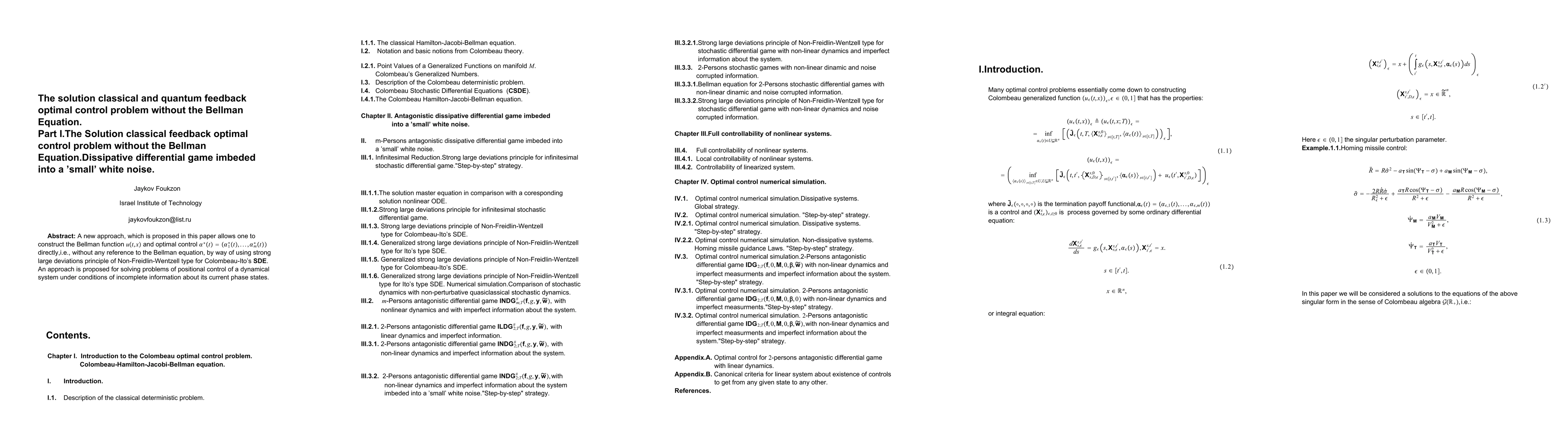 A new approach, which is proposed in this paper allows one to construct the Bellman function V(t,x) and optimal control u(t) directly,i.e.,without any reference to the Bellman equation, by way of using strong large deviations principle for the solutions Colombeau-Ito's SDE.