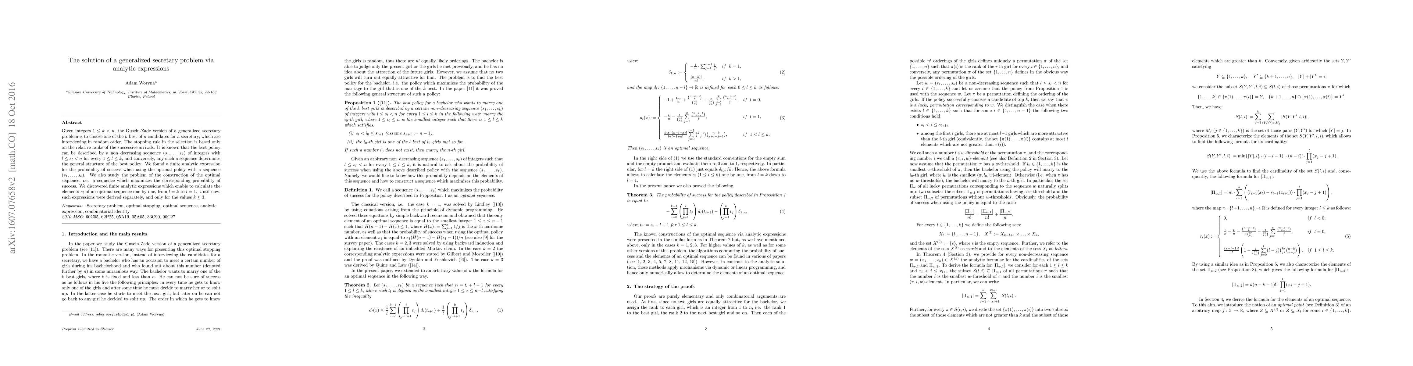 The paper provides a generalized solution to the Gusein-Zade version of the secretary problem, offering finite analytic expressions for calculating success probabilities using optimal policies and constructing optimal sequences.