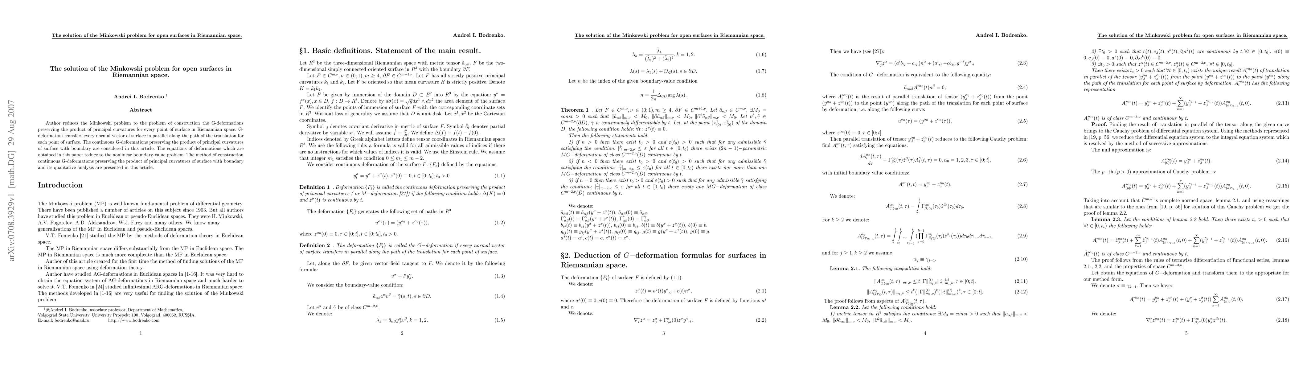 Author reduces the Minkowski problem to the problem of construction the G-deformations preserving the product of principal curvatures for every point of surface in Riemannian space. G-deformation transfers every normal vector of surface in parallel along the path of the translation for each point of surface. The continuous G-deformations preserving the product of principal curvatures of surface with boundary are considered in this article. The equations of deformations which are obtained in this paper reduce to the nonlinear boundary-value problem. The method of construction continuous G-deformations preserving the product of principal curvatures of surface with boundary and its qualitative analysis are presented in this article
