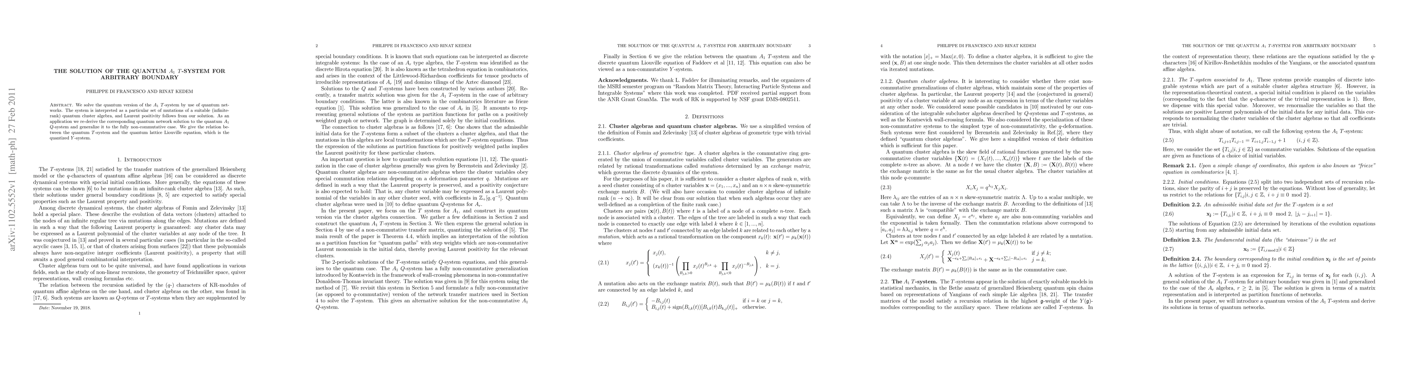 We solve the quantum version of the $A_1$ $T$-system by use of quantum networks. The system is interpreted as a particular set of mutations of a suitable (infinite-rank) quantum cluster algebra, and Laurent positivity follows from our solution. As an application we re-derive the corresponding quantum network solution to the quantum $A_1$ $Q$-system and generalize it to the fully non-commutative case. We give the relation between the quantum $T$-system and the quantum lattice Liouville equation, which is the quantized $Y$-system.