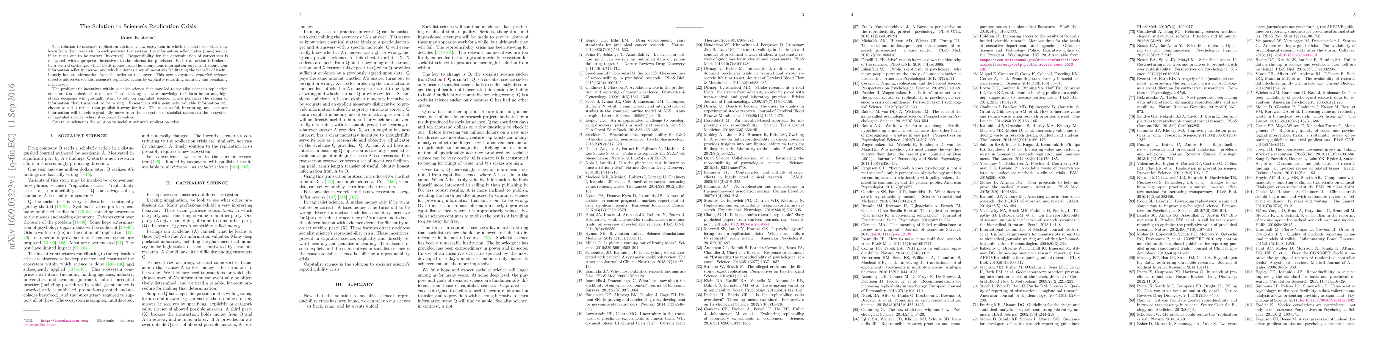 The paper proposes a capitalist ecosystem to solve science's replication crisis, where scientists sell their research findings, earning money for accurate predictions and losing for incorrect ones, with a central exchange managing transactions and incentives. This system aims to reward accuracy and penalize inaccuracy, contrasting with traditional socialist science approaches.