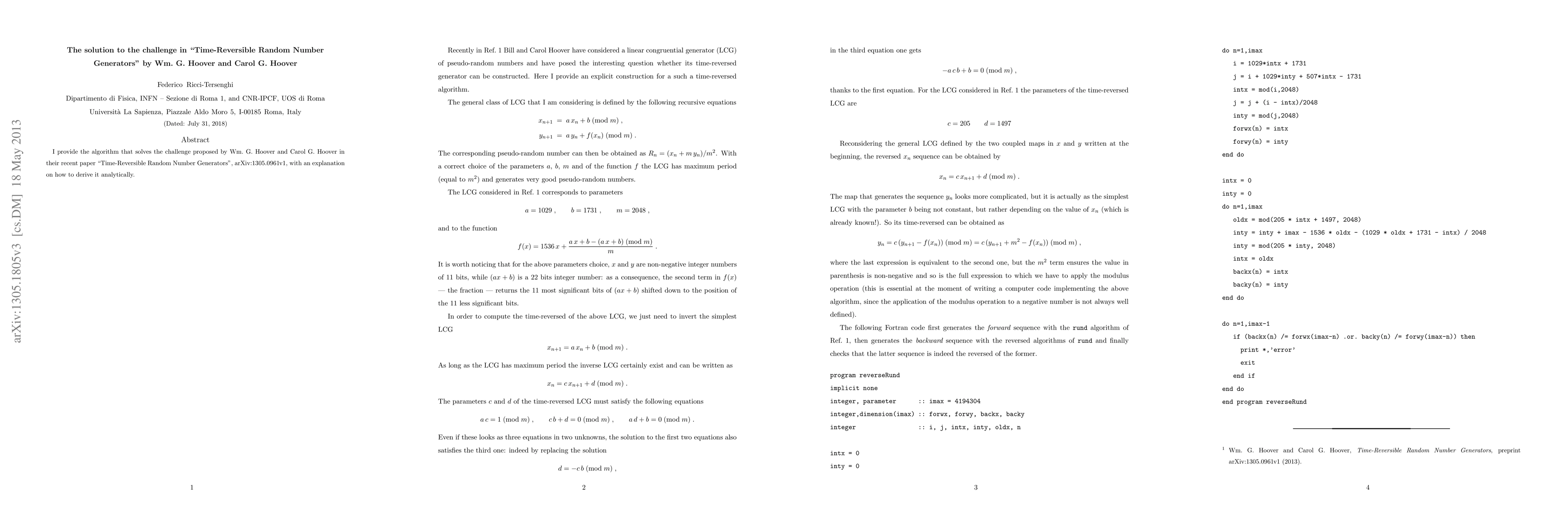 I provide the algorithm that solves the challenge proposed by Wm. G. Hoover and Carol G. Hoover in their recent paper "Time-Reversible Random Number Generators", arXiv:1305.0961, with an explanation on how to derive it analytically.