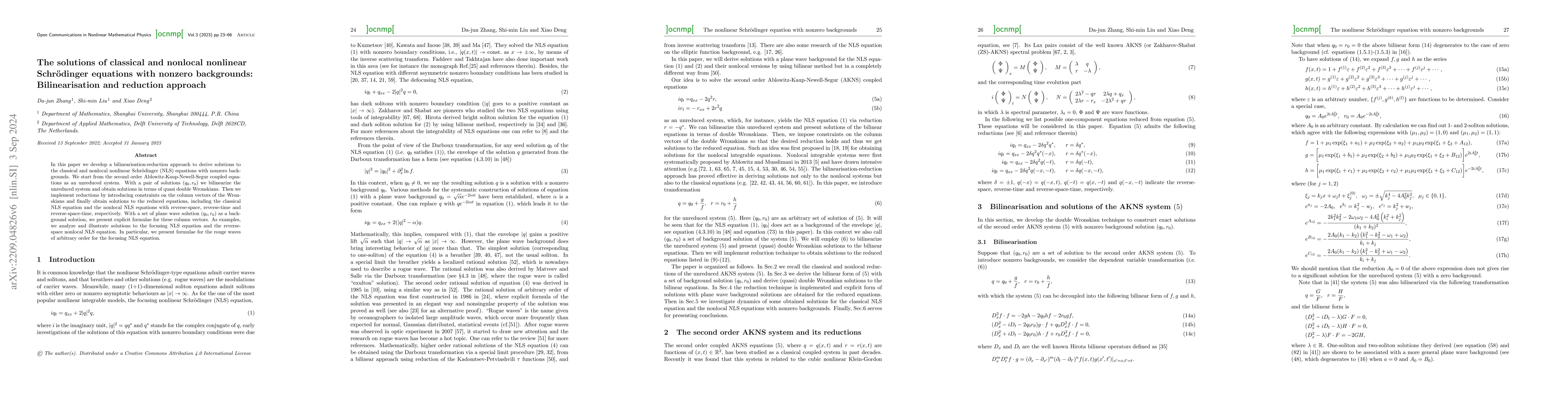 This paper develops a bilinearisation-reduction approach to solve classical and nonlocal nonlinear Schrödinger equations with nonzero backgrounds. It derives solutions through quasi double Wronskians and constraints, illustrating them with plane wave examples and presenting explicit formulae for rogue waves.