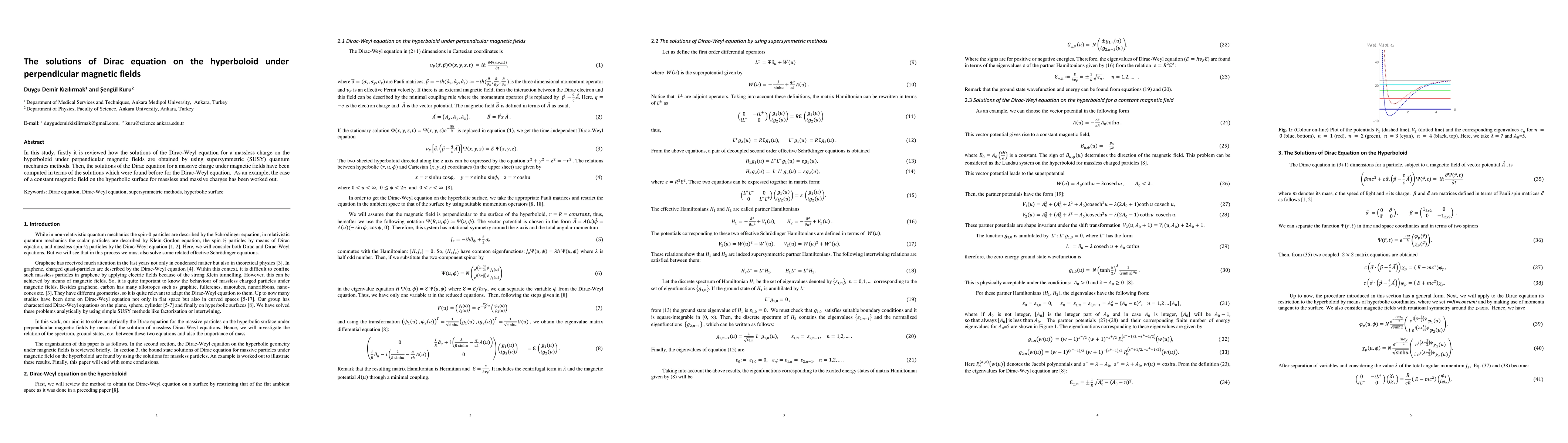 This paper reviews the supersymmetric quantum mechanics methods for obtaining solutions of the Dirac-Weyl equation for a massless charge on a hyperboloid under perpendicular magnetic fields, and extends this to compute solutions for the Dirac equation for a massive charge under similar conditions.