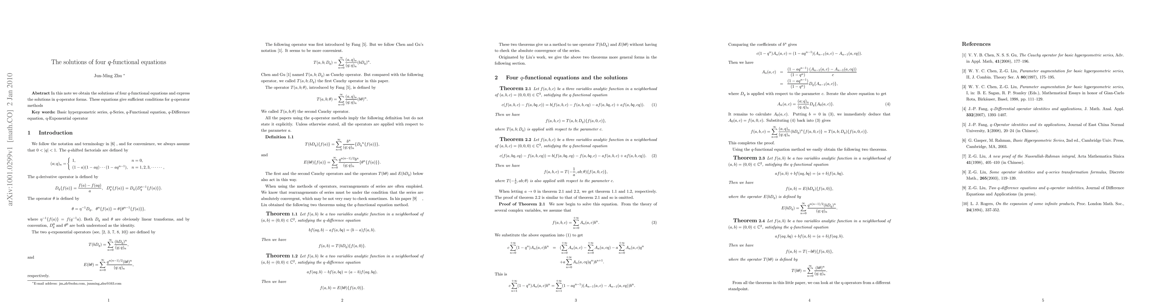 In this note we obtain the solutions of four $q$-functional equations and express the solutions in $q$-operator forms. These equations give sufficient conditions for $q$-operator methods.
