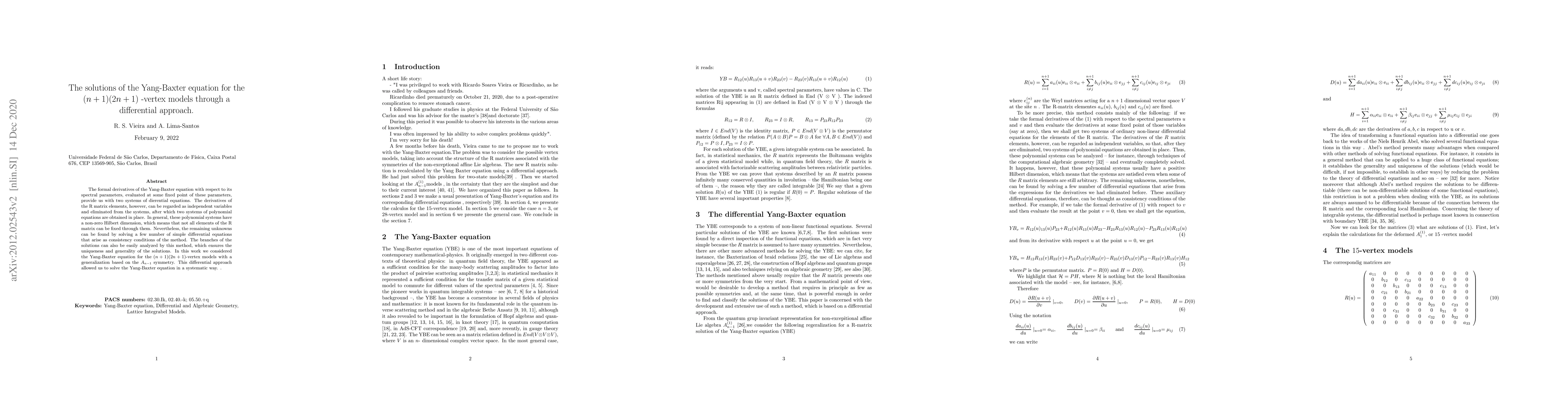 This research presents a differential approach to solve the Yang-Baxter equation for $(n+1)(2n+1)$-vertex models, reducing complex systems of differential equations into polynomial equations. Despite non-zero Hilbert dimensions, the method identifies remaining unknowns via simple differential equations, ensuring solution uniqueness and generality. This systematic approach also facilitates analysis of solution branches.