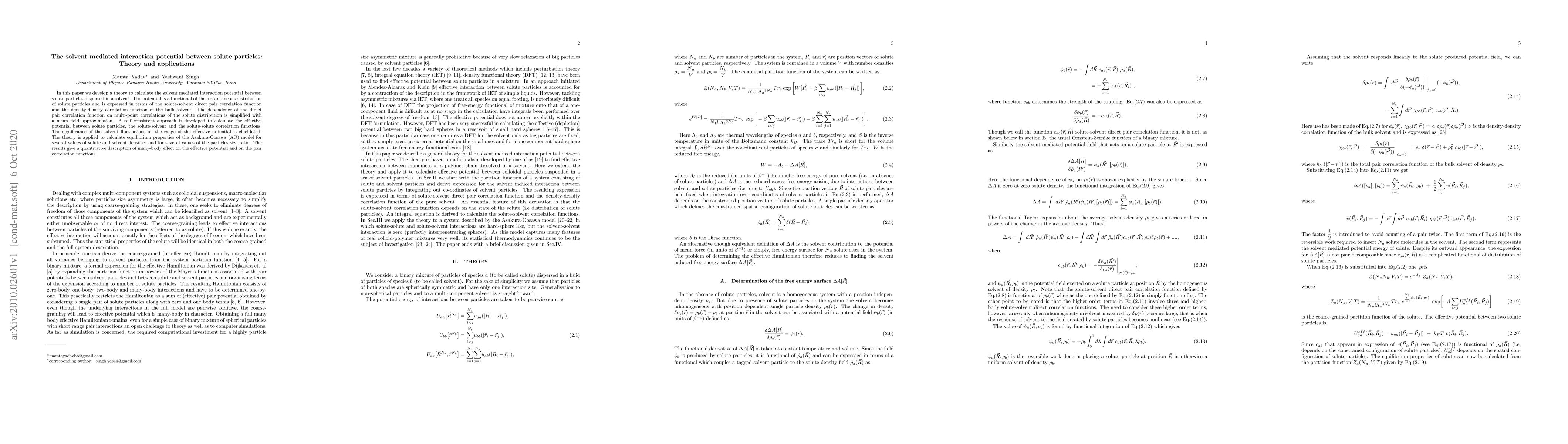 This paper develops a theoretical framework to compute the solvent-mediated interaction potential between solute particles, using mean field approximations and self-consistent approaches. The theory elucidates the impact of solvent fluctuations and is applied to the AO model, providing insights into many-body effects on effective potentials and pair correlation functions.
