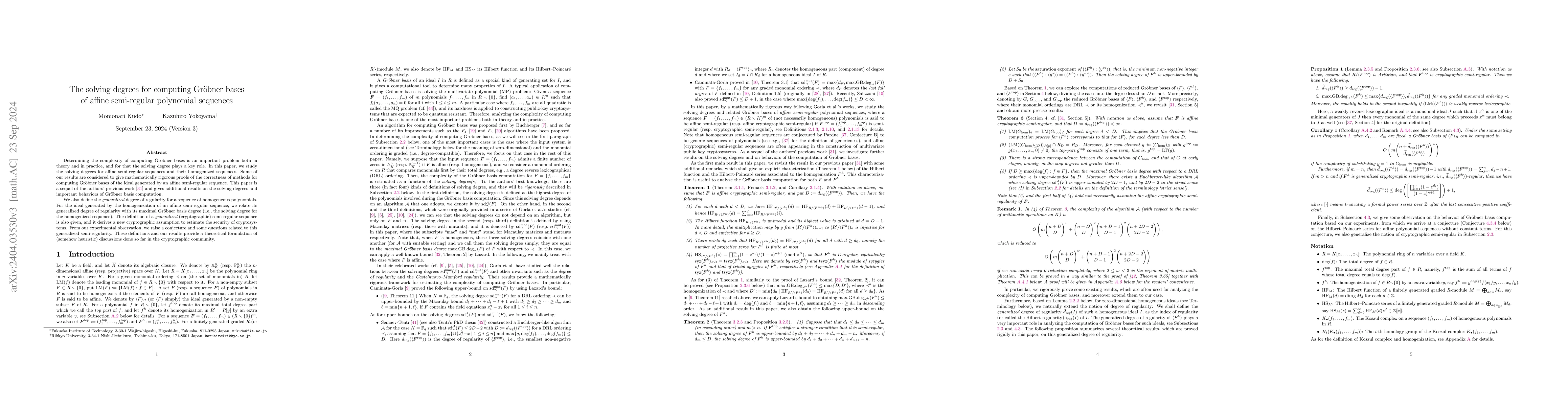 This paper investigates solving degrees for computing Gröbner bases of affine semi-regular polynomial sequences and their homogenizations, providing rigorous proofs for existing methods. It introduces a generalized degree of regularity for sequences and conjectures new cryptographic assumptions for estimating security in cryptosystems.