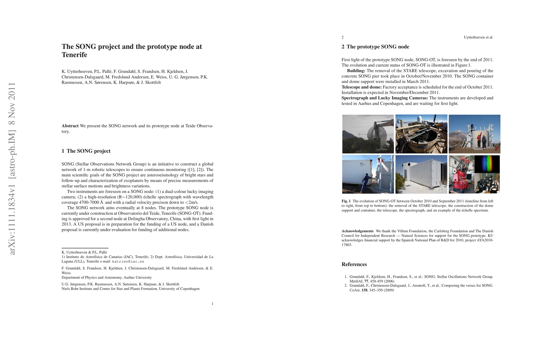 The SONG project is developing a global network of robotic telescopes for asteroseismology and exoplanet characterization. The prototype node at Tenerife's Observatorio del Teide is set to achieve first light by December 2011, featuring instruments designed for precise stellar measurements.