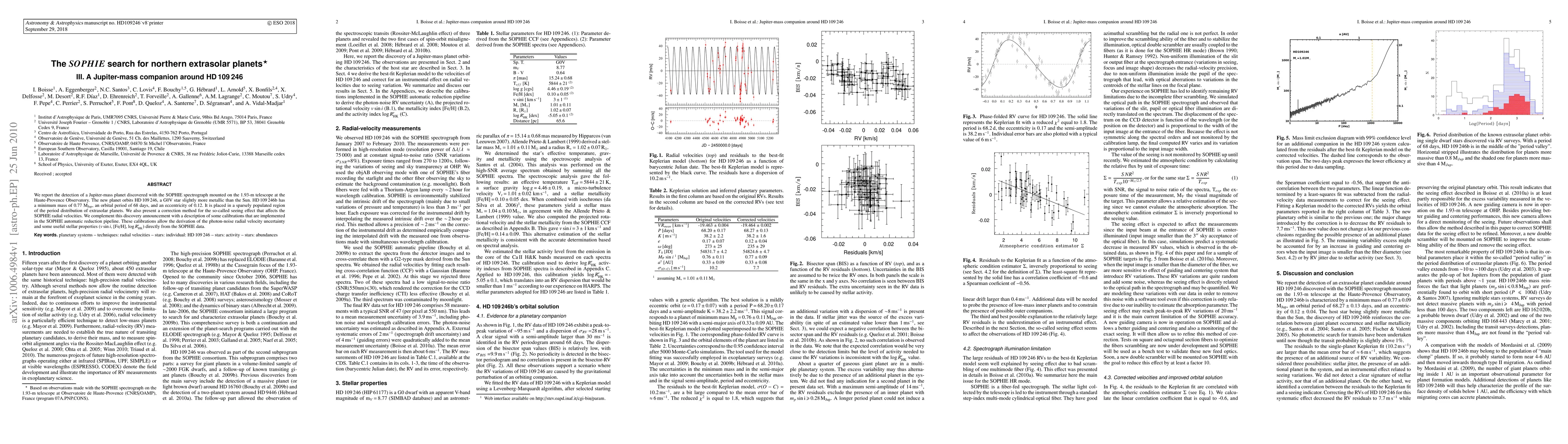 The SOPHIE spectrograph detected a Jupiter-mass planet, HD109246b, orbiting the G0V star HD 109246 with a minimum mass of 0.77 MJup, an orbital period of 68 days, and an eccentricity of 0.12. The study also introduced a correction method for the seeing effect and calibrations for deriving radial velocity uncertainties and stellar properties from SOPHIE data.