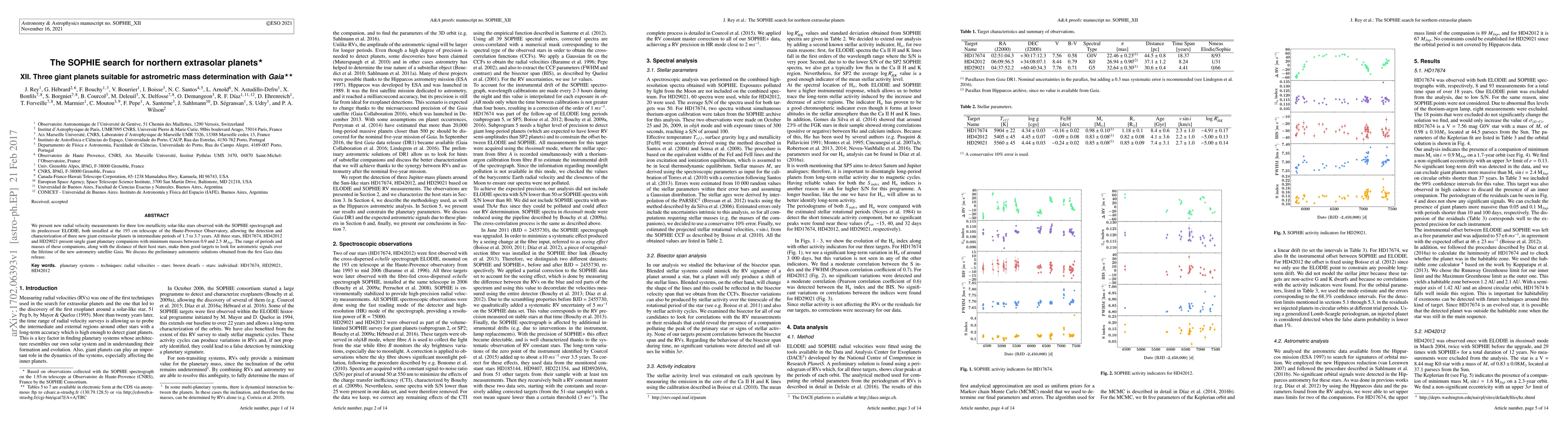 We present new radial velocity measurements for three low-metallicity solar-like stars observed with the SOPHIE spectrograph and its predecessor ELODIE, both installed at the 193 cm telescope of the Haute-Provence Observatory, allowing the detection and characterization of three new giant extrasolar planets in intermediate periods of 1.7 to 3.7 years. All three stars, HD17674, HD42012 and HD29021 present single giant planetary companions with minimum masses between 0.9 and 2.5 MJup. The range of periods and masses of these companions, along with the distance of their host stars, make them good targets to look for astrometric signals over the lifetime of the new astrometry satellite Gaia. We discuss the preliminary astrometric solutions obtained from the first Gaia data release.