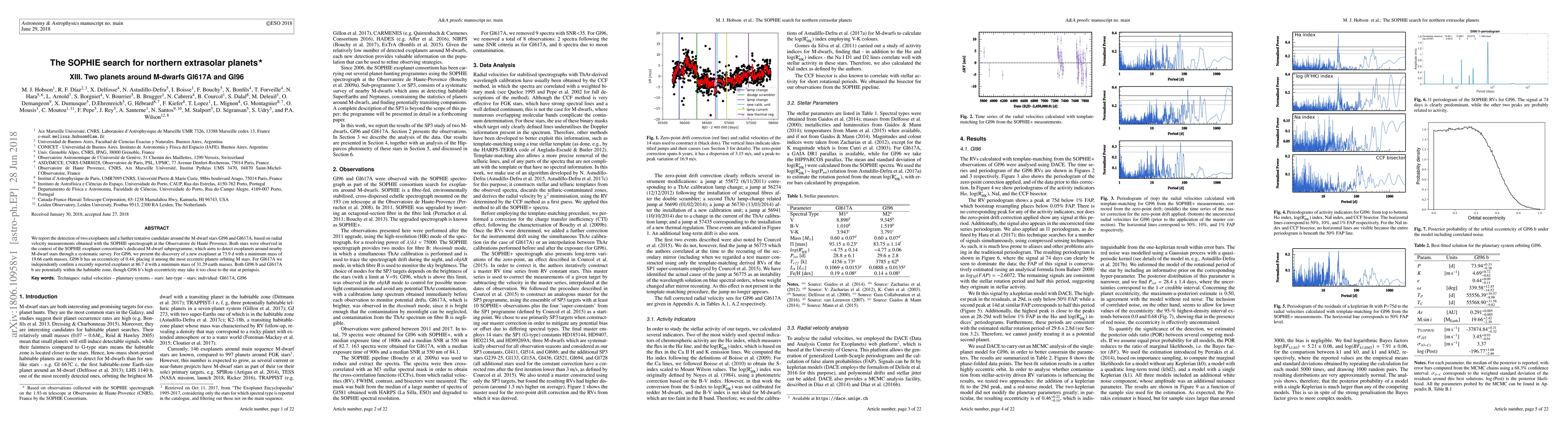 We report the detection of two exoplanets and a further tentative candidate around the M-dwarf stars Gl96 and Gl617A, based on radial velocity measurements obtained with the SOPHIE spectrograph at the Observatoire de Haute-Provence. Both stars were observed in the context of the SOPHIE exoplanet consortium's dedicated M-dwarf subprogramme, which aims to detect exoplanets around nearby M-dwarf stars through a systematic survey. For Gl96, we present the discovery of a new exoplanet at 73.9 d with a minimum mass of 19.66 earth masses. Gl96 b has an eccentricity of 0.44, placing it among the most eccentric planets orbiting M stars. For Gl617A we independently confirm a recently reported exoplanet at 86.7 d with a minimum mass of 31.29 earth masses. Both Gl96 b and Gl617A b are potentially within the habitable zone, though Gl96 b's high eccentricity may take it too close to the star at periapsis.