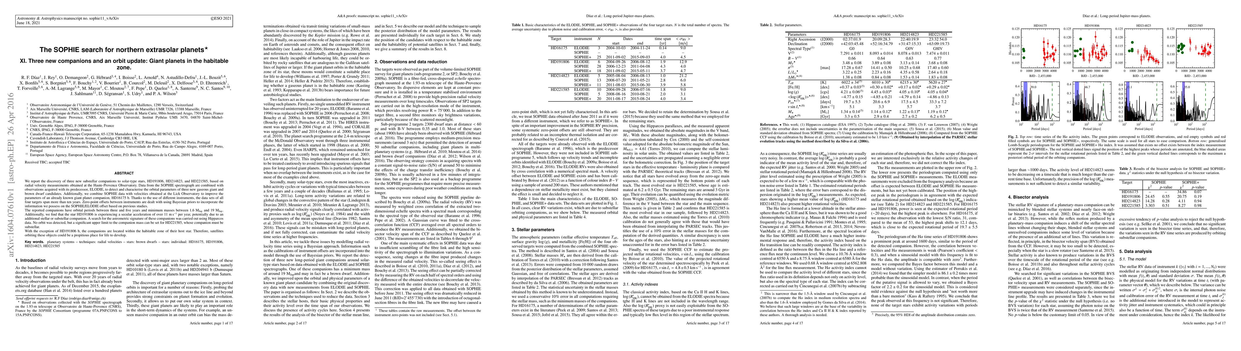 We report the discovery of three new substellar companions to solar-type stars, HD191806, HD214823, and HD221585, based on radial velocity measurements obtained at the Haute-Provence Observatory. Data from the SOPHIE spectrograph are combined with observations acquired with its predecessor, ELODIE, to detect and characterise the orbital parameters of three new gaseous giant and brown dwarf candidates. Additionally, we combine SOPHIE data with velocities obtained at the Lick Observatory to improve the parameters of an already known giant planet companion, HD16175 b. Thanks to the use of different instruments, the data sets of all four targets span more than ten years. Zero-point offsets between instruments are dealt with using Bayesian priors to incorporate the information we possess on the SOPHIE/ELODIE offset based on previous studies. The reported companions have orbital periods between three and five years and minimum masses between 1.6 Mjup and 19 Mjup. Additionally, we find that the star HD191806 is experiencing a secular acceleration of over 11 \ms\ per year, potentially due to an additional stellar or substellar companion. A search for the astrometric signature of these companions was carried out using Hipparcos data. No orbit was detected, but a significant upper limit to the companion mass can be set for HD221585, whose companion must be substellar. With the exception of HD191806 b, the companions are located within the habitable zone of their host star. Therefore, satellites orbiting these objects could be a propitious place for life to develop.