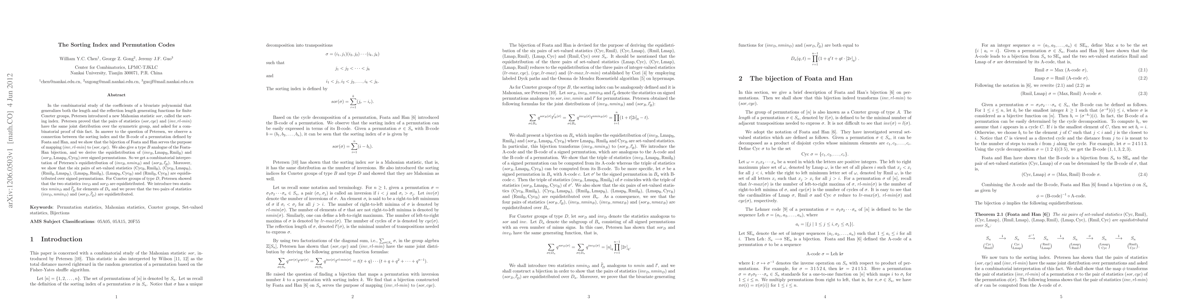 In the combinatorial study of the coefficients of a bivariate polynomial that generalizes both the length and the reflection length generating functions for finite Coxeter groups, Petersen introduced a new Mahonian statistic $sor$, called the sorting index. Petersen proved that the pairs of statistics $(sor,cyc)$ and $(inv,rl\textrm{-}min)$ have the same joint distribution over the symmetric group, and asked for a combinatorial proof of this fact. In answer to the question of Petersen, we observe a connection between the sorting index and the B-code of a permutation defined by Foata and Han, and we show that the bijection of Foata and Han serves the purpose of mapping $(inv,rl\textrm{-}min)$ to $(sor,cyc)$. We also give a type $B$ analogue of the Foata-Han bijection, and we derive the quidistribution of $(inv_B,{\rm Lmap_B},{\rm Rmil_B})$ and $(sor_B,{\rm Lmap_B},{\rm Cyc_B})$ over signed permutations. So we get a combinatorial interpretation of Petersen's equidistribution of $(inv_B,nmin_B)$ and $(sor_B,l_B')$. Moreover, we show that the six pairs of set-valued statistics $\rm (Cyc_B,Rmil_B)$, $\rm(Cyc_B,Lmap_B)$, $\rm(Rmil_B,Lmap_B)$, $\rm(Lmap_B,Rmil_B)$, $\rm(Lmap_B,Cyc_B)$ and $\rm(Rmil_B,Cyc_B)$ are equidistributed over signed permutations. For Coxeter groups of type $D$, Petersen showed that the two statistics $inv_D$ and $sor_D$ are equidistributed. We introduce two statistics $nmin_D$ and $\tilde{l}_D'$ for elements of $D_n$ and we prove that the two pairs of statistics $(inv_D,nmin_D)$ and $(sor_D,\tilde{l}_D')$ are equidistributed.