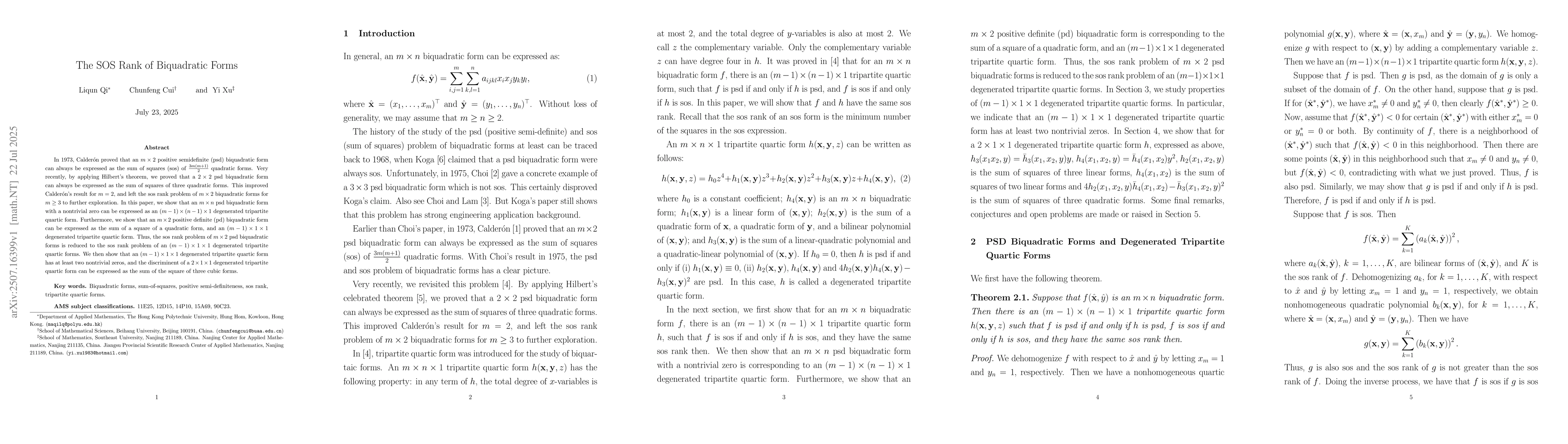 In 1973, Calder\'{o}n proved that an $m \times 2$ positive semidefinite (psd) biquadratic form can always be expressed as the sum of squares (sos) of ${3m(m+1) \over 2}$ quadratic forms. Very recently, by applying Hilbert's theorem, we proved that a $2 \times 2$ psd biquadratic form can always be expressed as the sum of squares of three quadratic forms. This improved Calder\'{o}n's result for $m=2$, and left the sos rank problem of $m \times 2$ biquadratic forms for $m \ge 3$ to further exploration. In this paper, we show that an $m \times n$ psd biquadratic form with a nontrivial zero {can} be expressed as an $(m-1) \times (n-1) \times 1$ degenerated tripartite quartic form. Furthermore, we show that an $m \times 2$ positive definite (pd) biquadratic form can be expressed as the sum of a square of a quadratic form, and an $(m-1) \times 1 \times 1$ degenerated tripartite quartic form. Thus, the sos rank problem of $m \times 2$ psd biquadratic forms is reduced to the sos rank problem of an $(m-1) \times 1 \times 1$ degenerated tripartite quartic forms. We then show that an $(m-1) \times 1 \times 1$ degenerated tripartite quartic form has at least two nontrivial zeros, and the discriminent of a $2 \times 1 \times 1$ degenerated tripartite quartic form can be expressed as the sum of the square of three cubic forms.