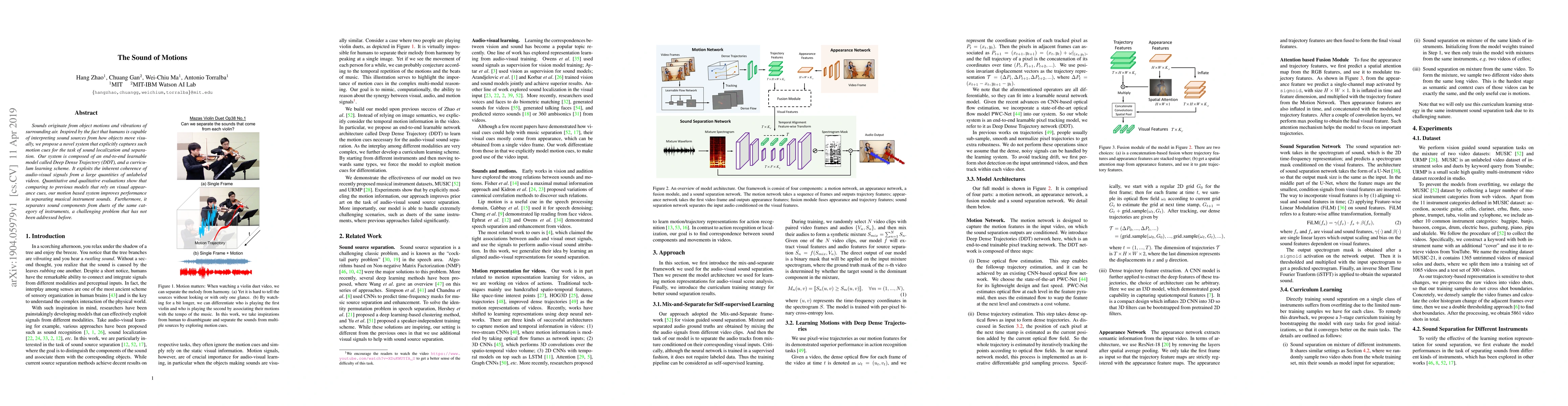 Sounds originate from object motions and vibrations of surrounding air. Inspired by the fact that humans is capable of interpreting sound sources from how objects move visually, we propose a novel system that explicitly captures such motion cues for the task of sound localization and separation. Our system is composed of an end-to-end learnable model called Deep Dense Trajectory (DDT), and a curriculum learning scheme. It exploits the inherent coherence of audio-visual signals from a large quantities of unlabeled videos. Quantitative and qualitative evaluations show that comparing to previous models that rely on visual appearance cues, our motion based system improves performance in separating musical instrument sounds. Furthermore, it separates sound components from duets of the same category of instruments, a challenging problem that has not been addressed before.