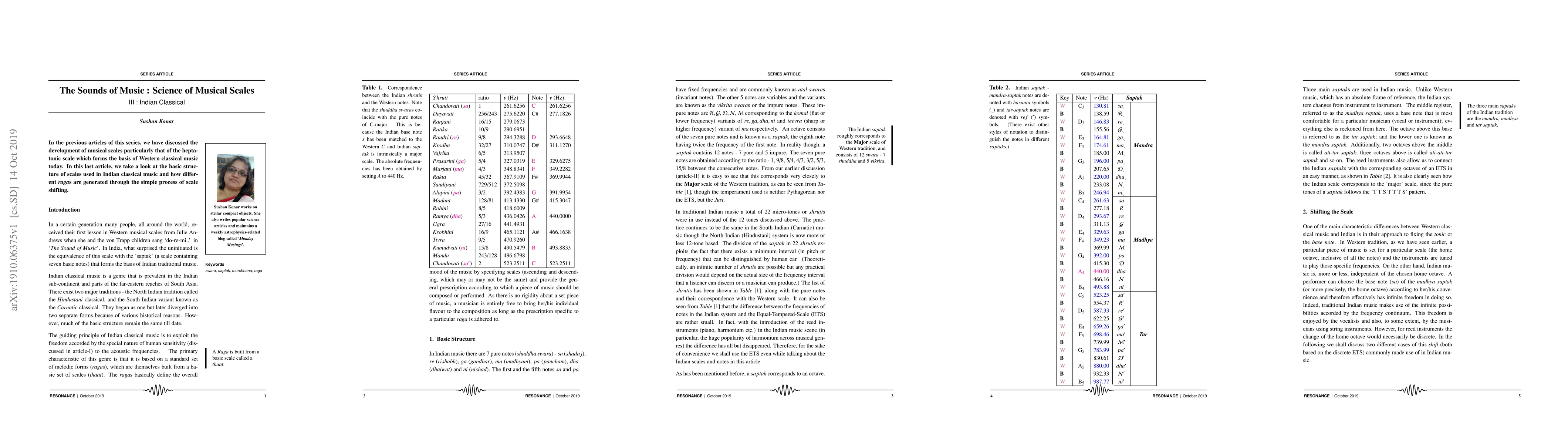 In the previous articles of this series, we have discussed the development of musical scales particularly that of the heptatonic scale which forms the basis of Western classical music today. In this last article, we take a look at the basic structure of scales used in Indian classical music and how different `raga's are generated through the simple process of scale shifting.