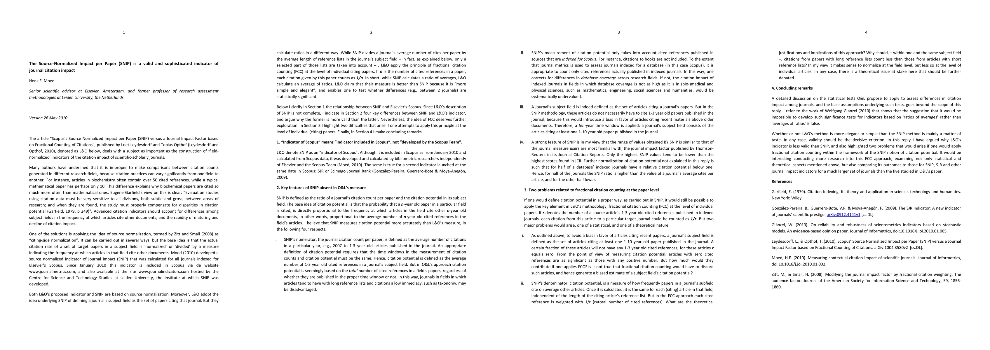 This paper is a reply to the article "Scopus's Source Normalized Impact per Paper (SNIP) versus a Journal Impact Factor based on Fractional Counting of Citations", published by Loet Leydesdorff and Tobias Opthof (arXiv:1004.3580v2 [cs.DL]). It clarifies the relationship between SNIP and Elsevier's Scopus. Since Leydesdorff and Opthof's description of SNIP is not complete, it indicates four key differences between SNIP and the indicator proposed by the two authors, and argues why the former is more valid than the latter. Nevertheless, the idea of fractional citation counting deserves further exploration. The paper discusses difficulties that arise if one attempts to apply this principle at the level of individual (citing) papers.