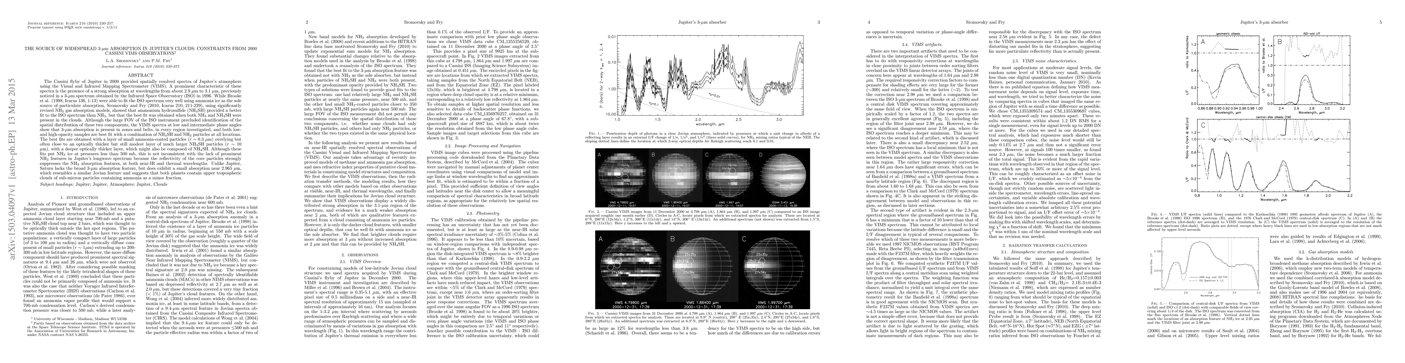 The Cassini flyby of Jupiter in 2000 provided spatially resolved spectra of Jupiter's atmosphere using the Visual and Infrared Mapping Spectrometer (VIMS). These spectra contain a strong absorption at wavelengths from about 2.9 $\mu$m to 3.1 $\mu$m, previously noticed in a 3-$\mu$m spectrum obtained by the Infrared Space Observatory (ISO) in 1996. While Brooke et al. (1998, Icarus 136, 1-13) were able to fit the ISO spectrum very well using ammonia ice as the sole source of particulate absorption, Sromovsky and Fry (2010, Icarus 210, 211-229), using significantly revised NH$_3$ gas absorption models, showed that ammonium hydrosulfide (NH$_4$SH) provided a better fit to the ISO spectrum than NH$_3$ , but that the best fit was obtained when both NH$_3$ and NH$_4$SH were present. Although the large FOV of the ISO instrument precluded identification of the spatial distribution of these two components, the VIMS spectra at low and intermediate phase angles show that 3-$\mu$m absorption is present in zones and belts, in every region investigated, and both low- and high-opacity samples are best fit with a combination of NH$_4$SH and NH$_3$ particles at all locations. The best fits are obtained with a layer of small ammonia-coated particles ($r\sim0.3$ $\mu$m) overlying but often close to an optically thicker but still modest layer of much larger NH$_4$SH particles ($r\sim 10$ $\mu$m), with a deeper optically thicker layer, which might also be composed of NH$_4$SH. Although these fits put NH$_3$ ice at pressures less than 500 mb, this is not inconsistent with the lack of prominent NH$_3$ features in Jupiter's longwave spectrum because the reflectivity of the core particles strongly suppresses the NH$_3$ absorption features, at both near-IR and thermal wavelengths.