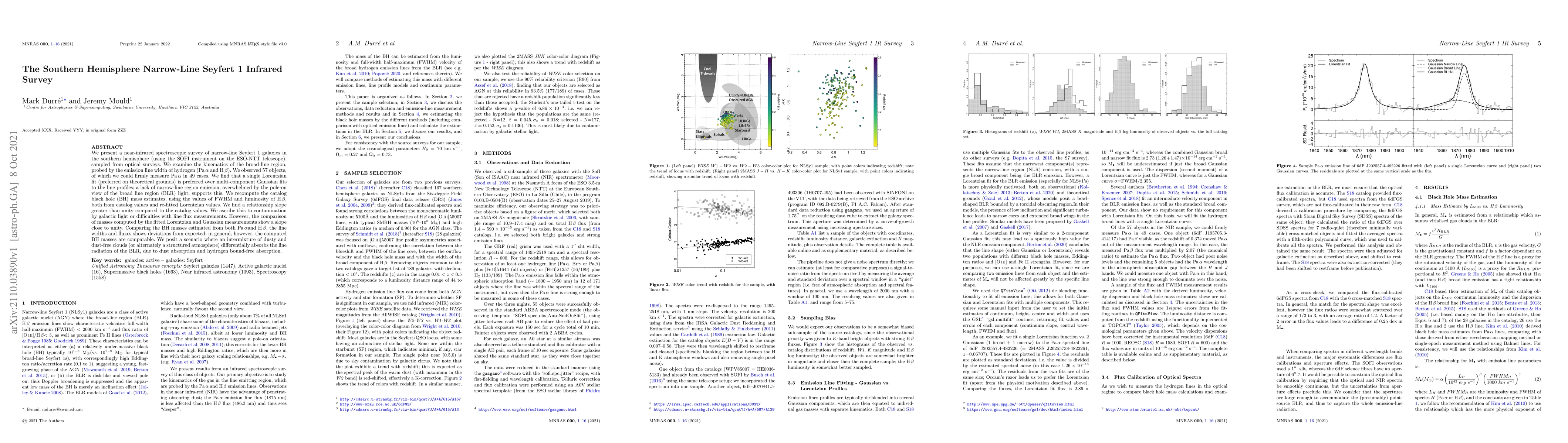 This paper presents a near-infrared spectroscopic survey of narrow-line Seyfert 1 galaxies in the southern hemisphere, revealing that a single Lorentzian fit better describes the broad-line region kinematics than multi-component Gaussian fits. The study finds that the black hole mass estimates derived from recomputed values show a greater slope than catalog values, likely due to contamination or measurement issues, but overall computed masses remain comparable.