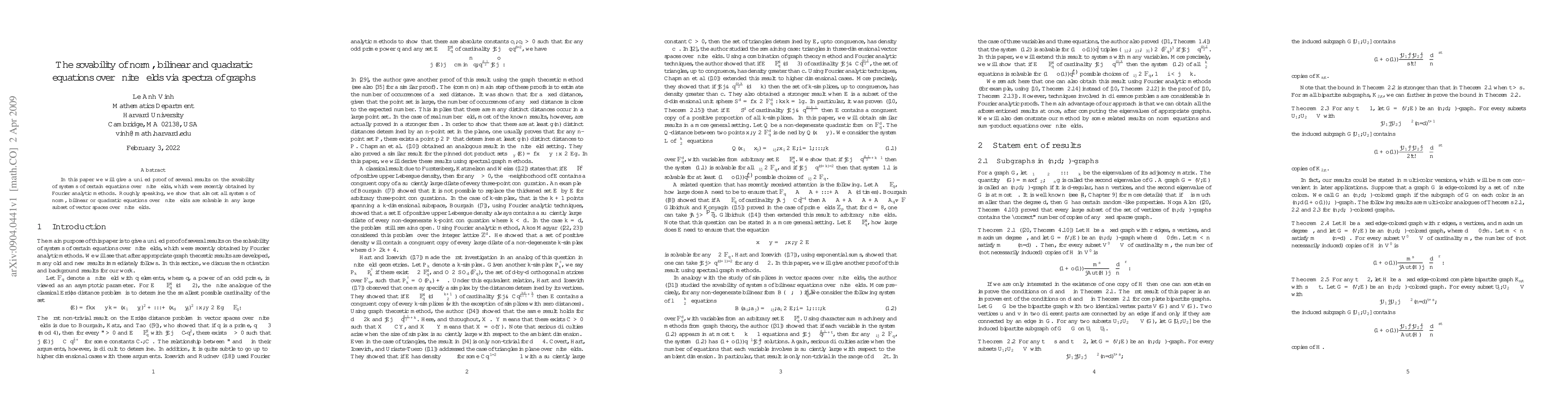Summary: This paper presents a unified proof for the solvability of norm, bilinear, and quadratic equations over finite fields, demonstrating that almost all such systems are solvable in large subsets of vector spaces over these fields, using graph spectra as a method.