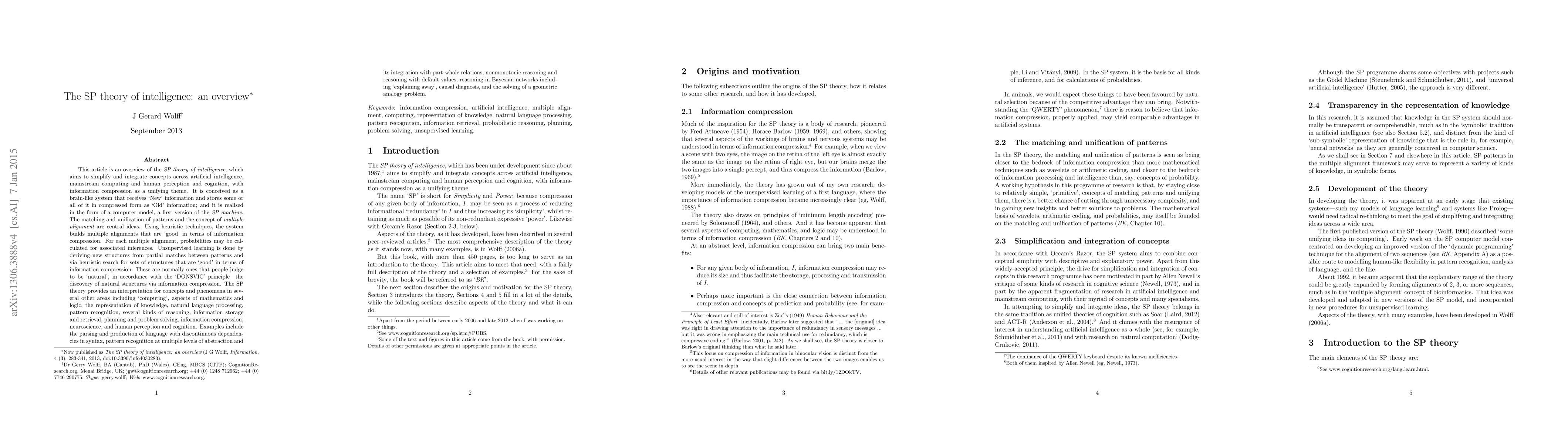 The SP theory of intelligence integrates concepts from AI, computing, and human cognition, emphasizing information compression and multiple alignments for efficient learning and inference. It employs heuristic techniques to discover natural structures, applicable across various domains including natural language processing, pattern recognition, and reasoning.