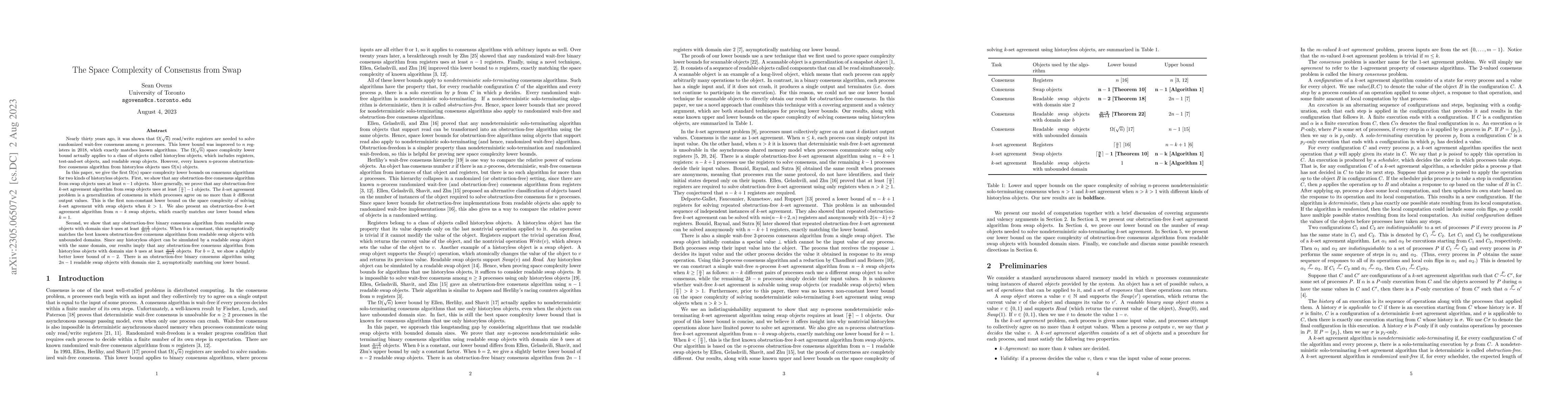 This paper establishes the first $\Omega(n)$ space complexity lower bounds for consensus algorithms using swap objects, proving that any obstruction-free consensus algorithm from swap objects requires at least $n-1$ objects, and for $k$-set agreement, at least $\lceil \frac{n}{k}\rceil - 1$ objects. It also provides a lower bound for binary consensus using readable swap objects, showing a minimum of $\frac{n-2}{3b+1}$ objects, with $b=2$ yielding $n-2$.
