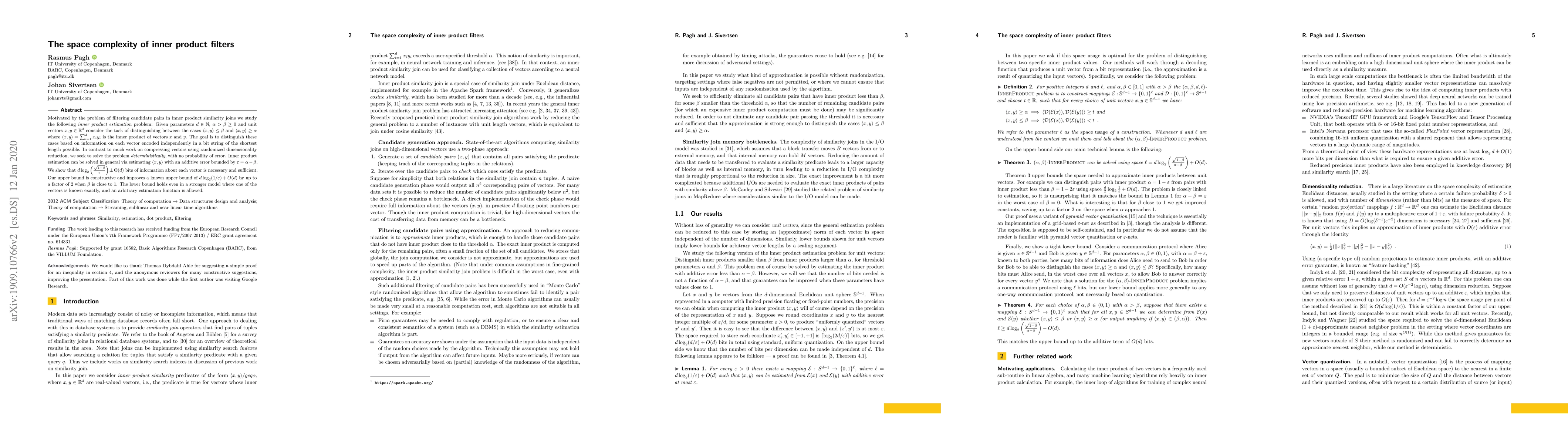 This paper investigates the space complexity of estimating inner product similarity between vectors, focusing on distinguishing between low and high inner product values. It demonstrates that $d \log_2 \left(\tfrac{\sqrt{1-\beta}}{\varepsilon}\right) \pm \Theta(d)$ bits are necessary and sufficient for this task, improving upon previous bounds when $\beta$ is close to 1.