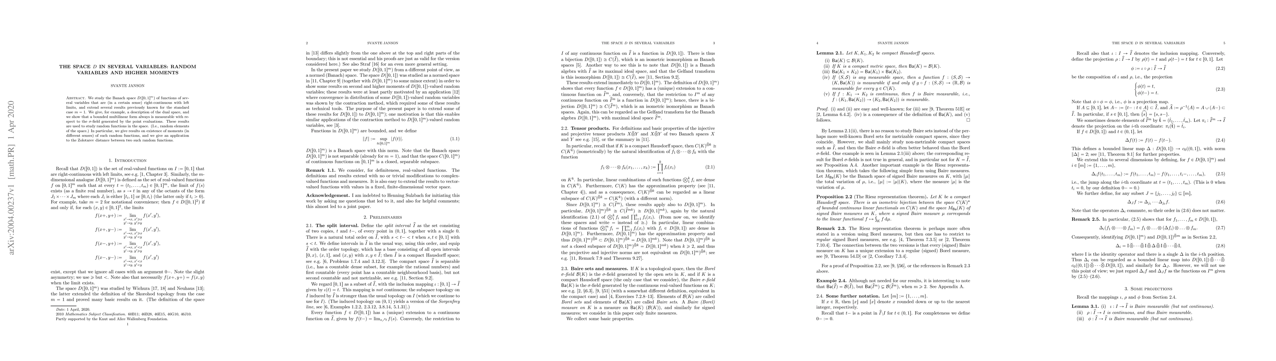 This paper investigates the Banach space $D([0,1]^m)$ of right-continuous functions with left limits in several variables, extending known results from the single-variable case. It describes the dual space and proves the measurability of bounded multilinear forms, then applies these findings to study random functions in $D$, including their moments and the Zolotarev distance.