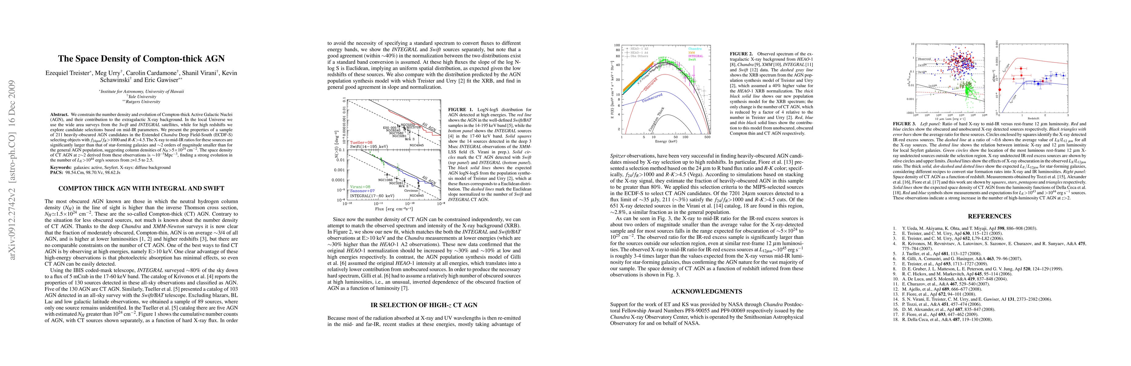 We constrain the number density and evolution of Compton-thick Active Galactic Nuclei (AGN), and their contribution to the extragalactic X-ray background. In the local Universe we use the wide area surveys from the Swift and INTEGRAL satellites, while for high redshifts we explore candidate selections based on mid-IR parameters. We present the properties of a sample of 211 heavily-obscured AGN candidates in the Extended Chandra Deep Field-South (ECDF-S) selecting objects with f24/fR>1000 and R-K>4.5. The X-ray to mid-IR ratios for these sources are significantly larger than that of star-forming galaxies and ~2 orders of magnitude smaller than for the general AGN population, suggesting column densities of NH>5x10^24 cm^-2. The space density of CT AGN at z~2 derived from these observations is ~10^-5 Mpc^{-3}, finding a strong evolution in the number of LX>10^44 erg/s sources from z=1.5 to 2.5.