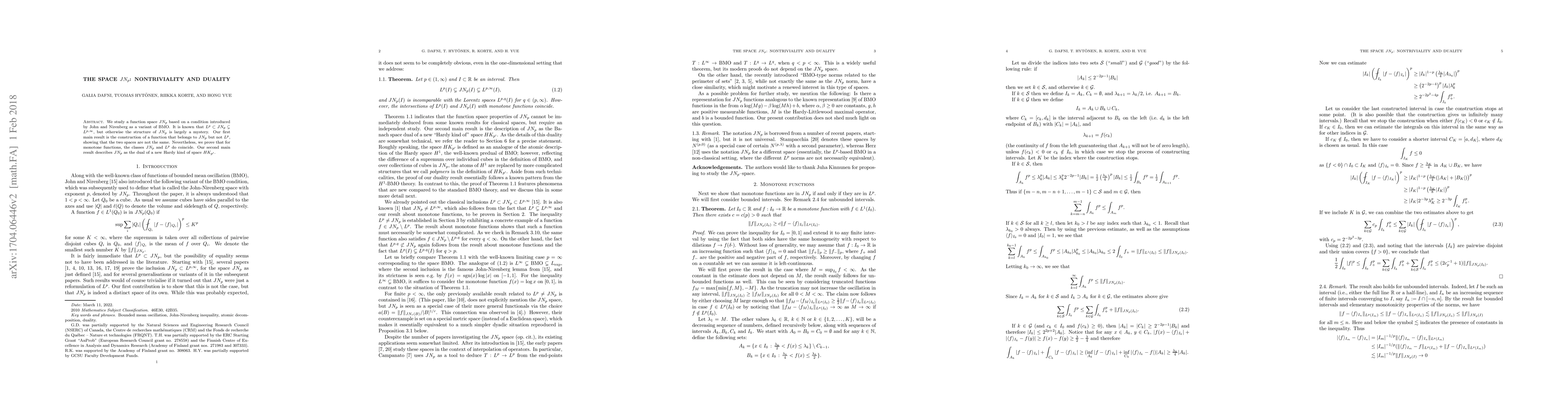 We study a function space $JN_p$ based on a condition introduced by John and Nirenberg as a variant of BMO. It is known that $L^p\subset JN_{p}\subsetneq L^{p,\infty}$, but otherwise the structure of $JN_p$ is largely a mystery. Our first main result is the construction of a function that belongs to $JN_p$ but not $L^p$, showing that the two spaces are not the same. Nevertheless, we prove that for monotone functions, the classes $JN_{p}$ and $L^p$ do coincide. Our second main result describes $JN_p$ as the dual of a new Hardy kind of space $HK_{p'}$.