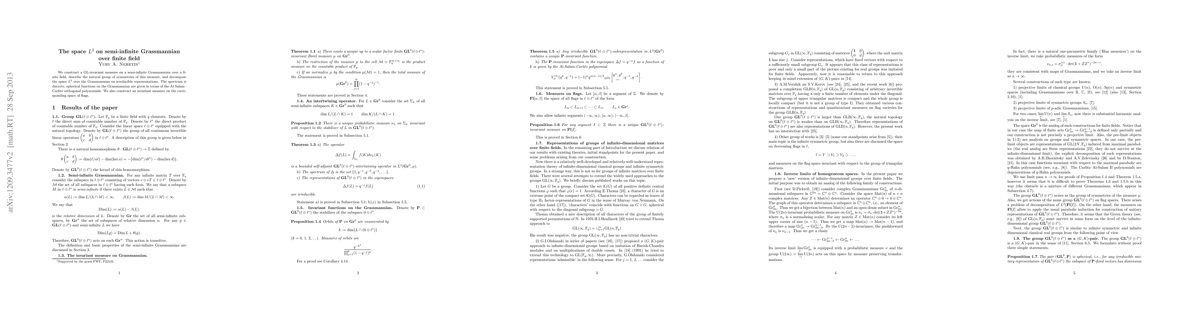 This paper constructs a $GL$-invariant measure on a semi-infinite Grassmannian over a finite field, decomposes the $L^2$ space into irreducible representations, and provides spherical functions expressed via Al Salam--Carlitz orthogonal polynomials. Additionally, it constructs an invariant measure on the associated space of flags.