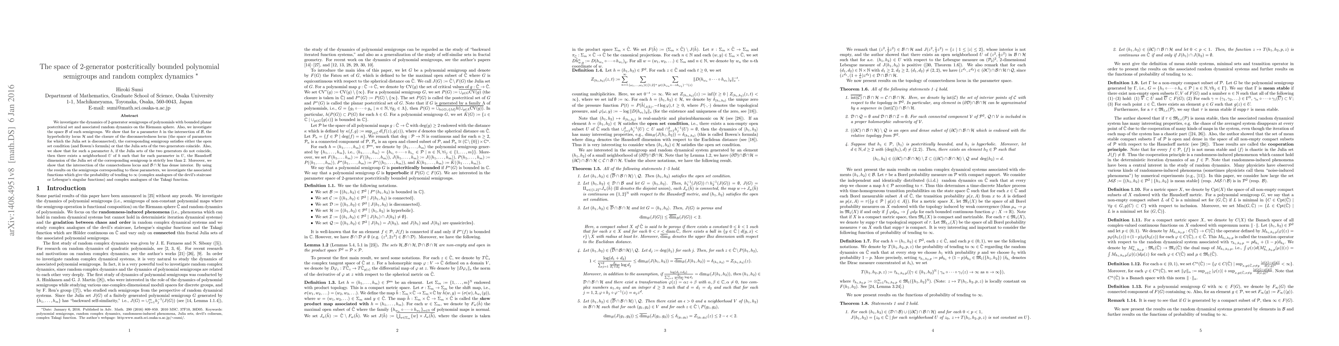 We investigate the dynamics of $2$-generator semigroups of polynomials with bounded planar postcritical set and associated random dynamics on the Riemann sphere. Also, we investigate the space ${\cal B}$ of such semigroups. We show that for a parameter $h$ in the intersection of ${\cal B}$, the hyperbolicity locus ${\cal H}$ and the closure of the disconnectedness locus (the space of parameters for which the Julia set is disconnected), the corresponding semigroup satisfies either the open set condition (and the Bowen's formula) or that the Julia sets of the two generators coincide. Also, we show that for such a parameter $h$, if the Julia sets of the two generators do not coincide, then there exists a neighborhood $U$ of $h$ in the full parameter space ${\cal P}^{2}$ such that for each parameter in $U$, the Hausdorff dimension of the Julia set of the corresponding semigroup is strictly less than 2. Moreover, we show that the intersection of the connectedness locus and ${\cal B}\cap {\cal H}$ has dense interior. By using the results on the semigroups corresponding to these parameters, we investigate the associated functions which give the probability of tending to $\infty$ (complex analogues of the devil's staircase or Lebesgue's singular functions) and complex analogues of the Takagi function.