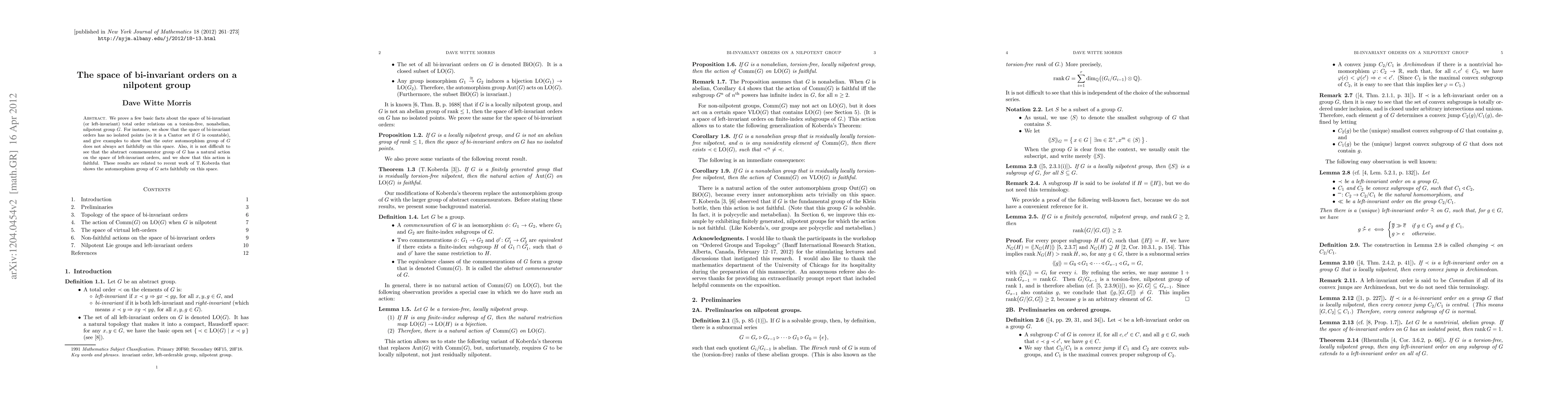 The paper proves several fundamental facts about the space of bi-invariant (or left-invariant) total order relations on a torsion-free, nonabelian, nilpotent group G, using concepts from group theory, topology, and orderable groups.