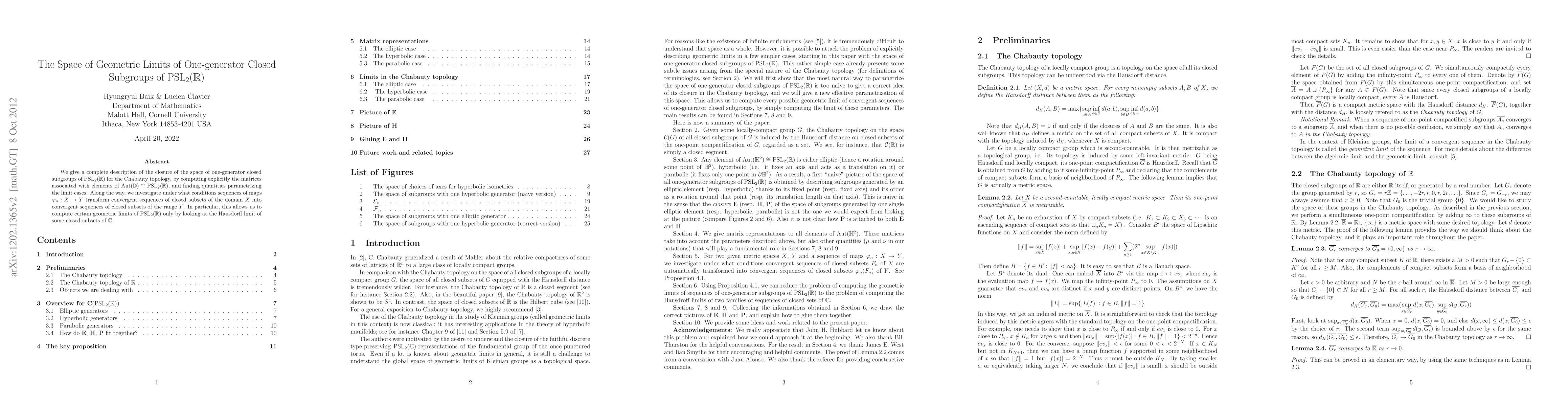 We give a complete description of the closure of the space of one-generator closed subgroups of PSL2(R) for the Chabauty topology, by computing explicitly the matrices associated with elements of Aut(D) = PSL2(R), and finding quantities parametrizing the limit cases. Along the way, we investigate under what conditions sequences of maps transform convergent sequences of closed subsets of the domain into convergent sequences of closed subsets of the range. In particular, this allows us to compute certain geometric limits of PSL2(R) only by looking at the Hausdorff limit of some closed subsets of C.