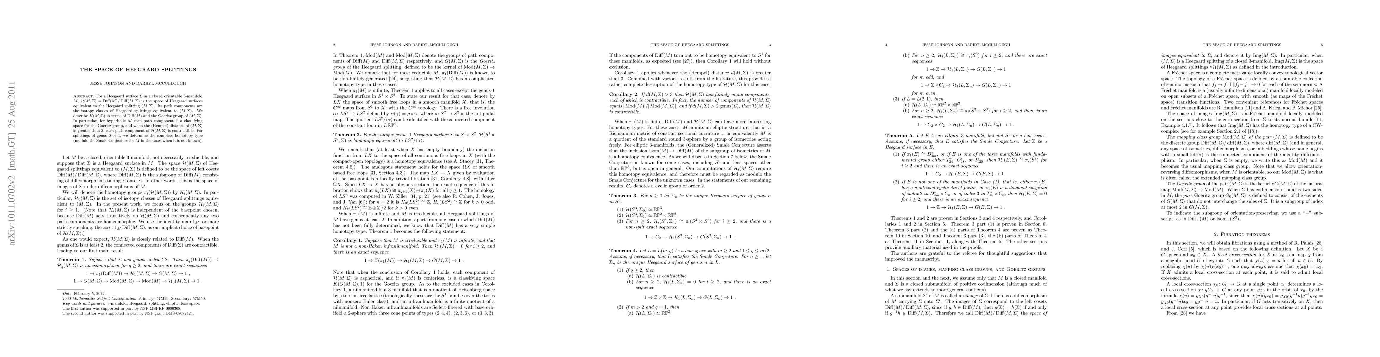This paper studies Heegaard surfaces in 3-manifolds, describing their space of equivalent surfaces in terms of diffeomorphism groups and the Goeritz group, with key findings including contractibility for certain hyperbolic manifolds and complete homotopy type determination.