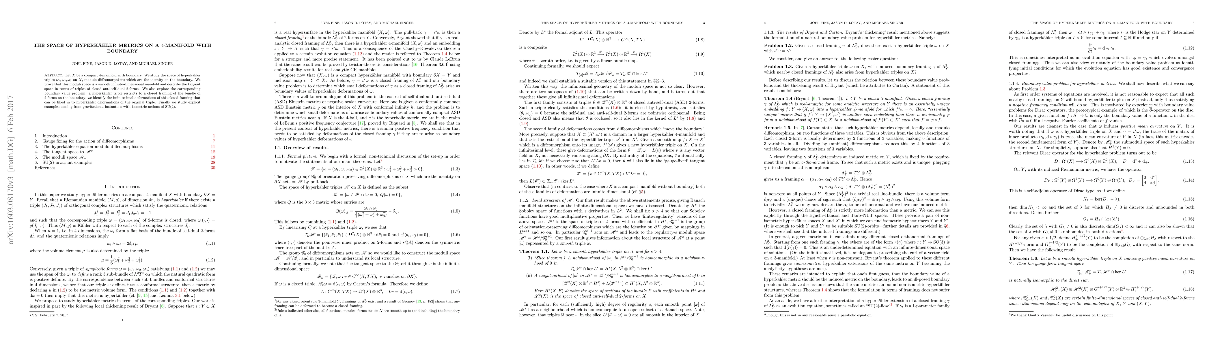 This paper studies the moduli space of hyperkähler metrics on a compact 4-manifold with boundary, proving it is a smooth infinite-dimensional manifold. It also examines the boundary value problem and explores infinitesimal deformations that can be extended to full hyperkähler deformations, using examples from gravitational instantons.