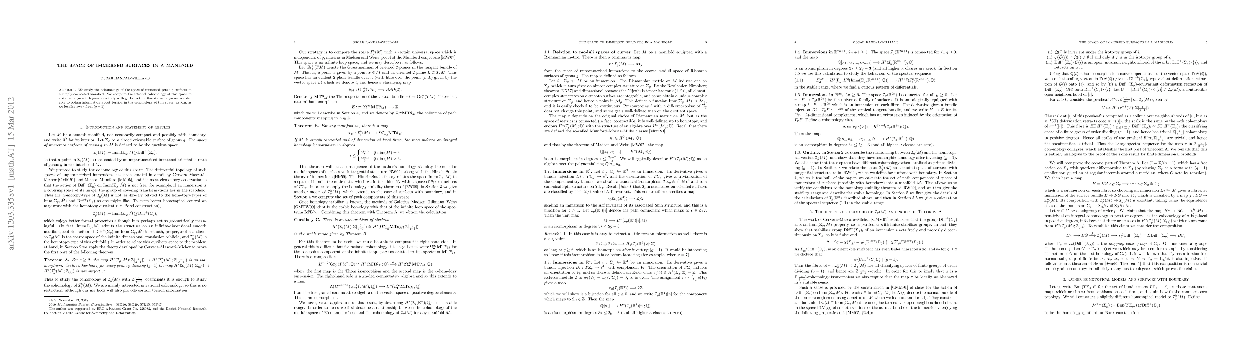 We study the cohomology of the space of immersed genus g surfaces in a simply-connected manifold. We compute the rational cohomology of this space in a stable range which goes to infinity with g. In fact, in this stable range we are also able to obtain information about torsion in the cohomology of this space, as long as we localise away from (g-1).