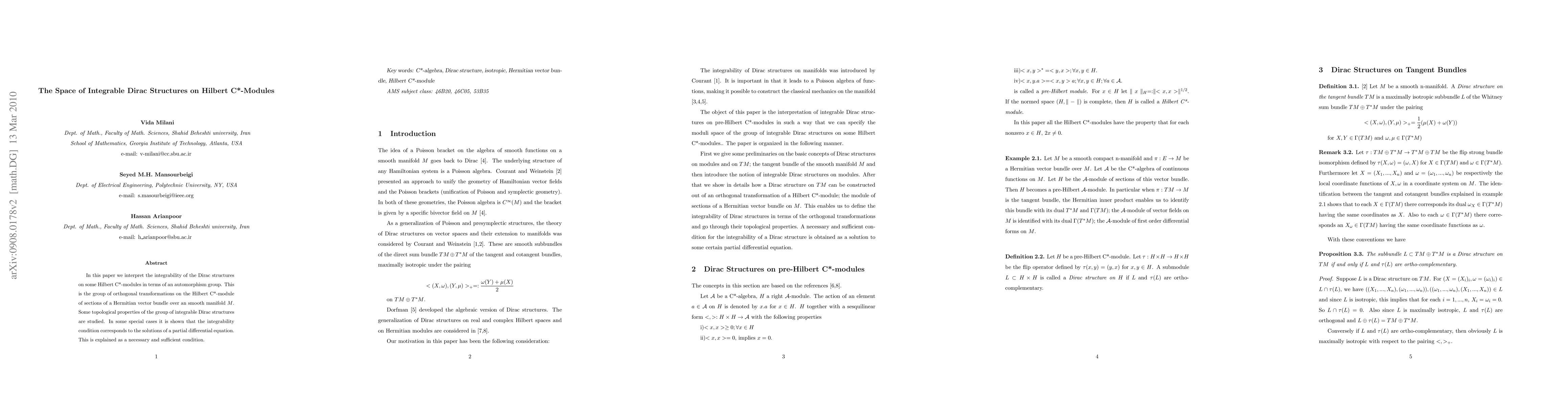 In this paper we interpret the integrability of the Dirac structures on some Hilbert C*-modules in terms of an automorphism group. This is the group of orthogonal transformations on the Hilbert C*-module of sections of a Hermitian vector bundle over an smooth manifold M. Some topological properties of the group of integrable Dirac structures are studied. In some special cases it is shown that the integrability condition corresponds to the solutions of a partial differential equation. This is explained as a necessary and sufficient condition.
