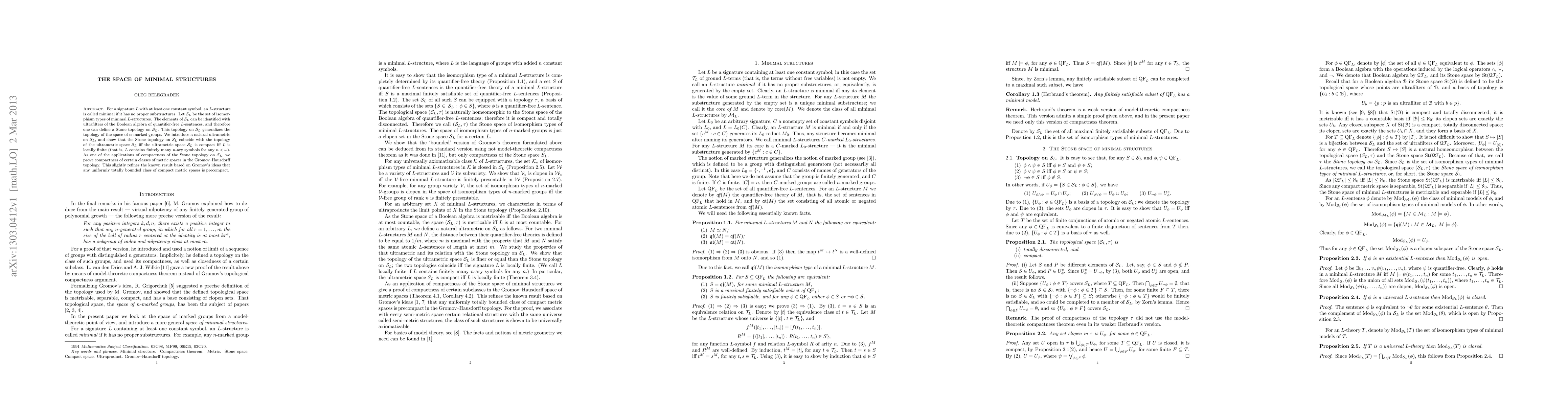 For a signature L with at least one constant symbol, an L-structure is called minimal if it has no proper substructures. Let S_L be the set of isomorphism types of minimal L-structures. The elements of S_L can be identified with ultrafilters of the Boolean algebra of quantifier-free L-sentences, and therefore one can define a Stone topology on S_L. This topology on S_L generalizes the topology of the space of n-marked groups. We introduce a natural ultrametric on S_L, and show that the Stone topology on S_L coincide with the topology of the ultrametric space S_L iff the ultrametric space S_L is compact iff L is locally finite (that is, L contains finitely many n-ary symbols for any n). As one of the applications of compactness of the Stone topology on S_L, we prove compactness of certain classes of metric spaces in the Gromov-Hausdorff topology. This slightly refines the known result based on Gromov's ideas that any uniformly totally bounded class of compact metric spases is precompact.