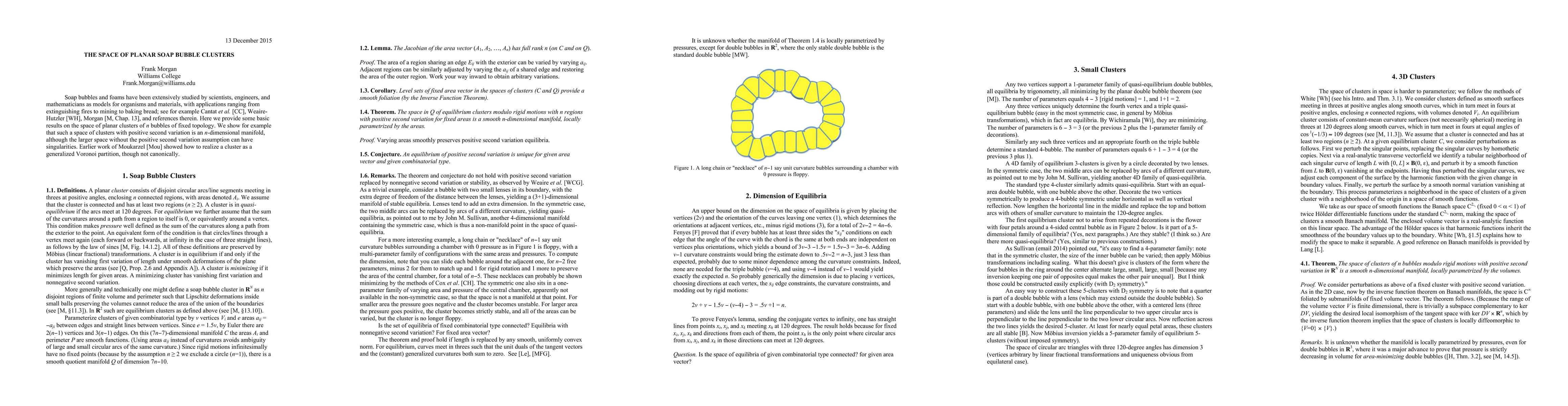This paper explores the geometric space of planar clusters formed by n soap bubbles of fixed topology, demonstrating that when clusters have a positive second variation, they form an n-dimensional manifold. It also notes that without this assumption, singularities can occur, referencing Moukarzel’s work on generalized Voronoi partitions.