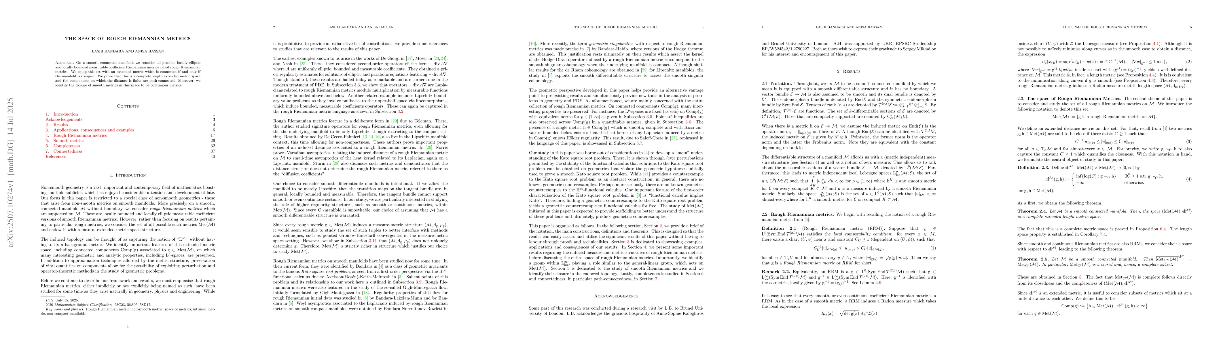 On a smooth connected manifold, we consider all possible locally elliptic and locally bounded measurable coefficient Riemannian metrics called rough Riemannian metrics. We equip this set with an extended metric which is connected if and only if the manifold is compact. We prove that this is a complete length extended metric space and the components on which the distance is finite are path-connected. Moreover, we identify the closure of smooth metrics in this space to be continuous metrics.