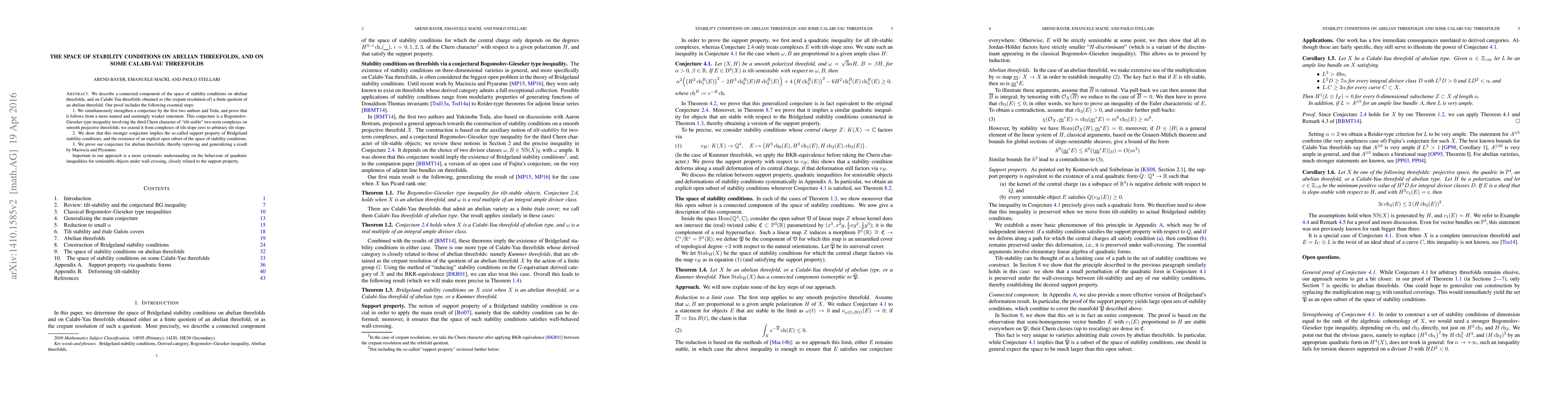 This paper explores a connected component of the space of stability conditions on abelian and certain Calabi-Yau threefolds, proving a strengthened conjecture that extends Bogomolov-Gieseker inequalities to arbitrary tilt-slopes. The authors demonstrate that this conjecture implies the support property of Bridgeland stability conditions and establish the existence of an explicit open subset in the space of stability conditions.